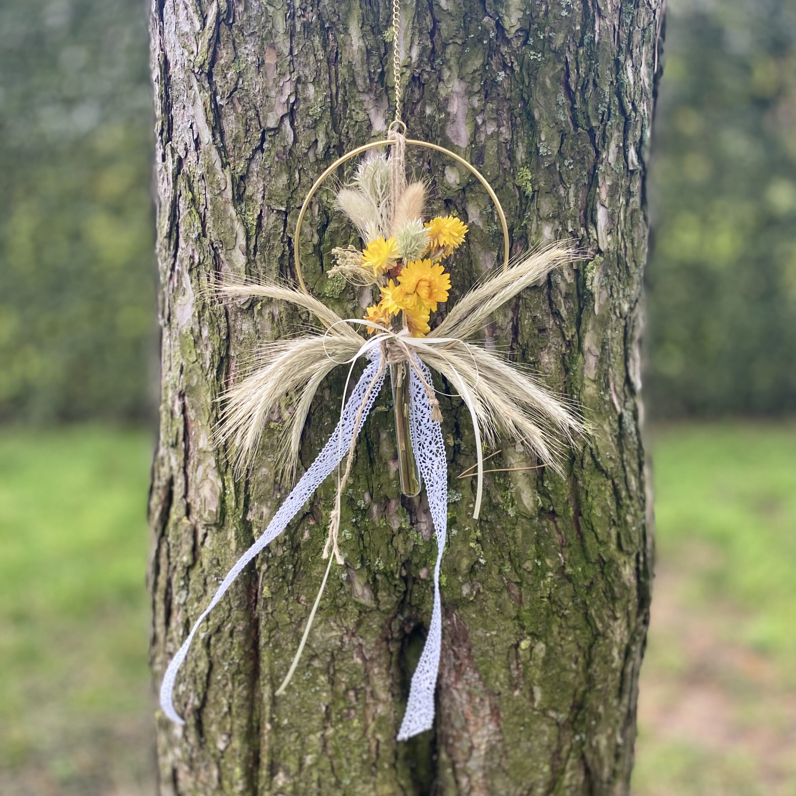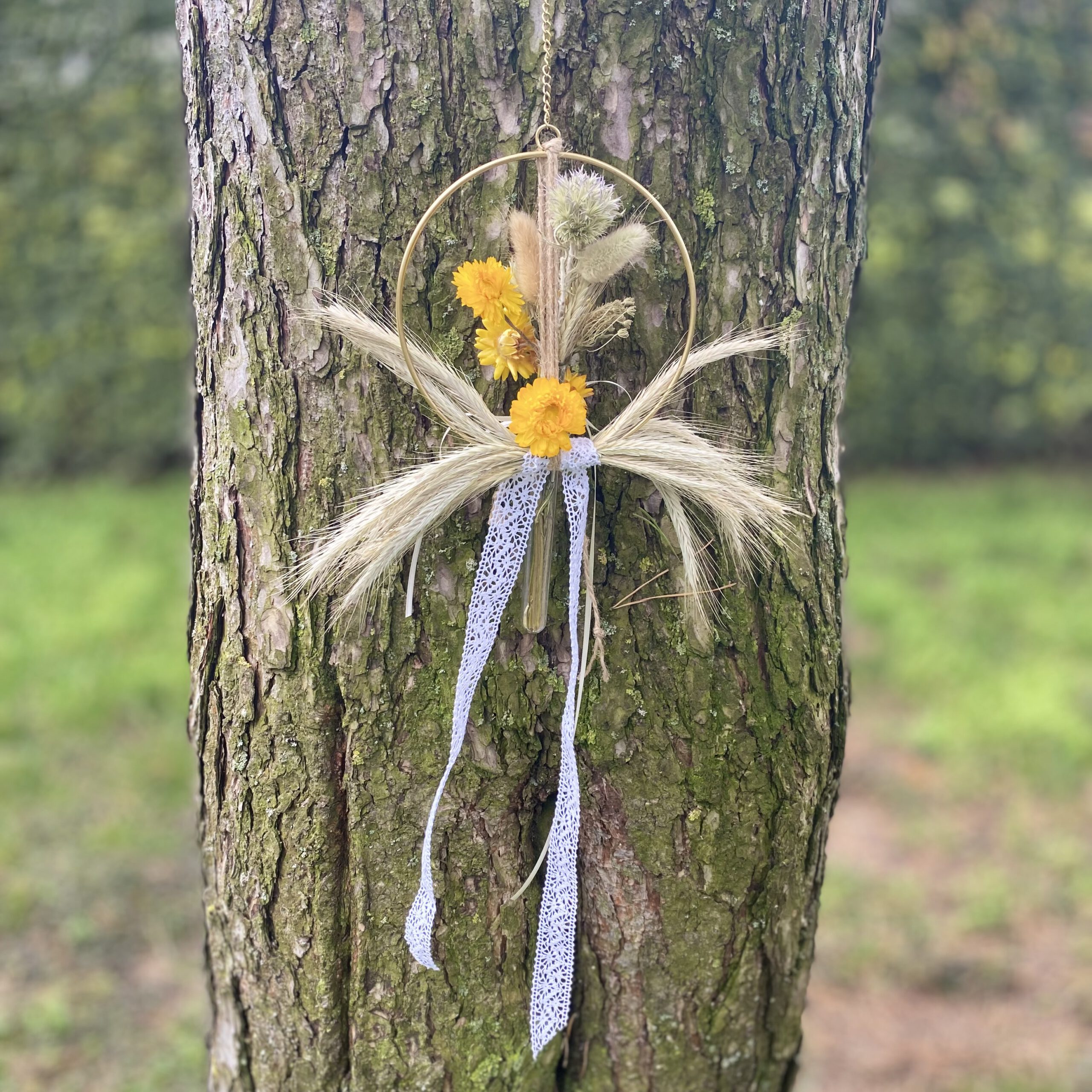 An dem Ring ist ein Reagenzglas mit weißen Spitzenschleifenband befestigt, in dem der kleine Trockenstrauß