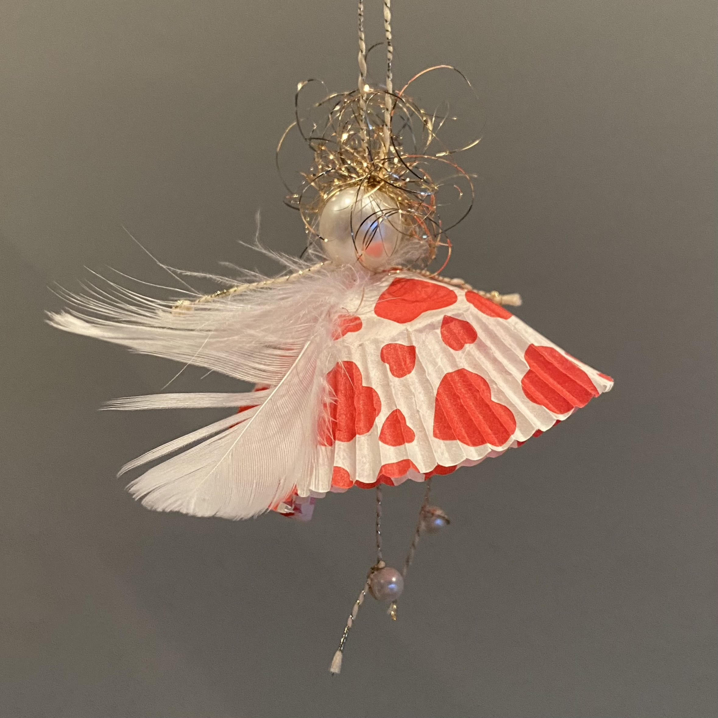 Selbstgemachter hängender Engel aus Muffinförmchen mit Herzmotiv mit Perlenkopf, Engelshaar und Flügel aus Federn sowie