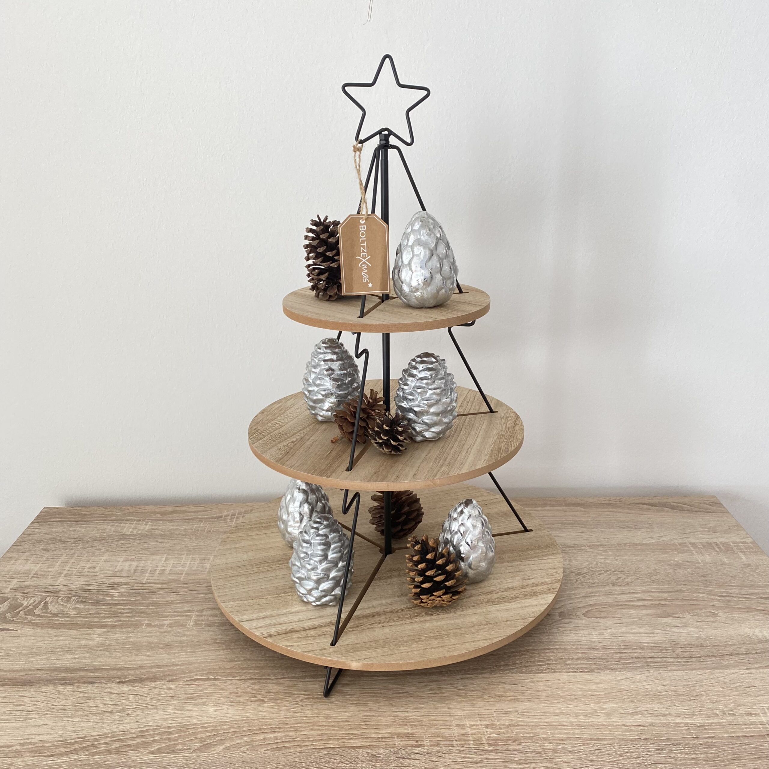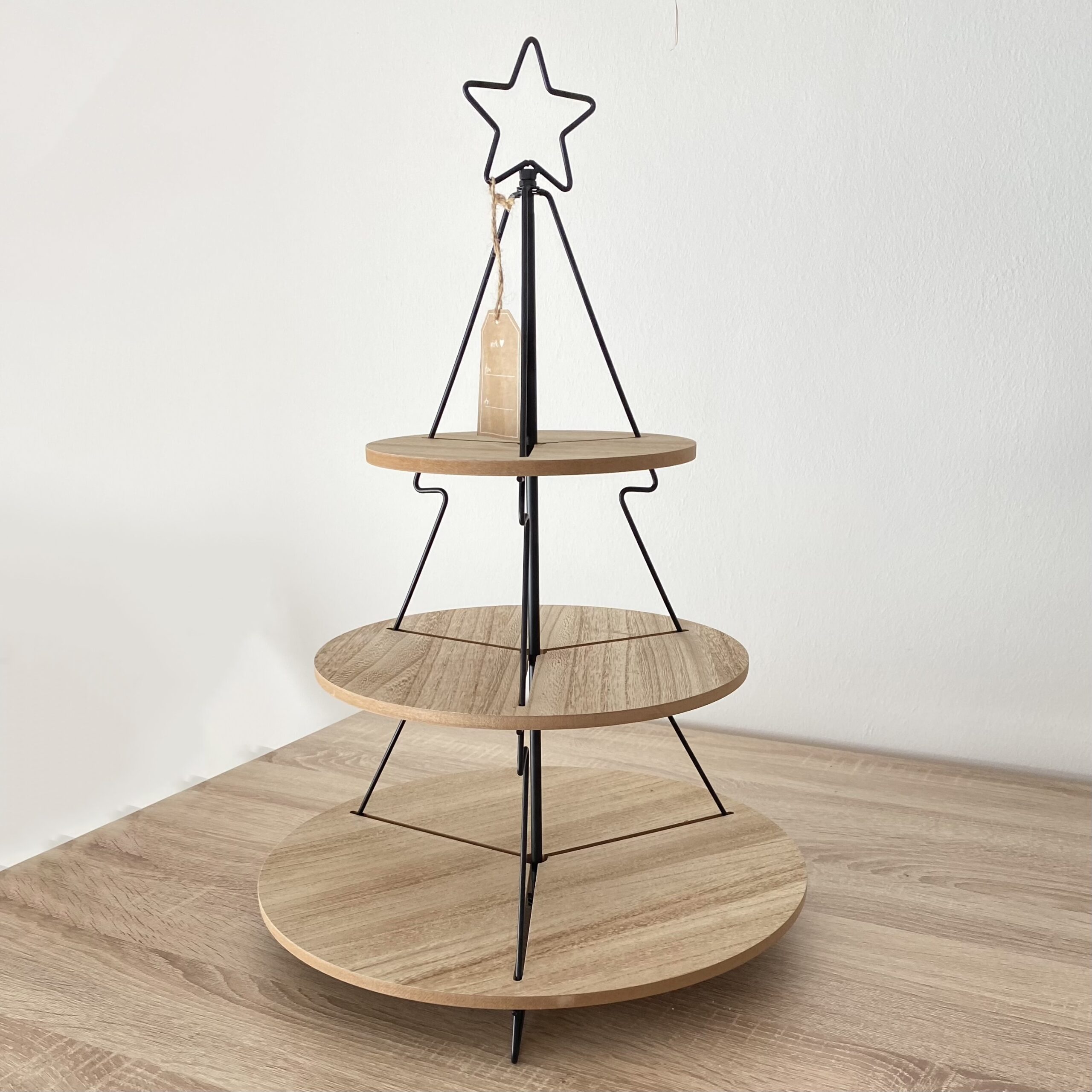 Tolle dreistöckige Etagere in Tannenbaumform mit abnehmbaren Stern aus Eichenholz und schwarzen Metallgestell für die Advents-und Weihnachtszeit.
