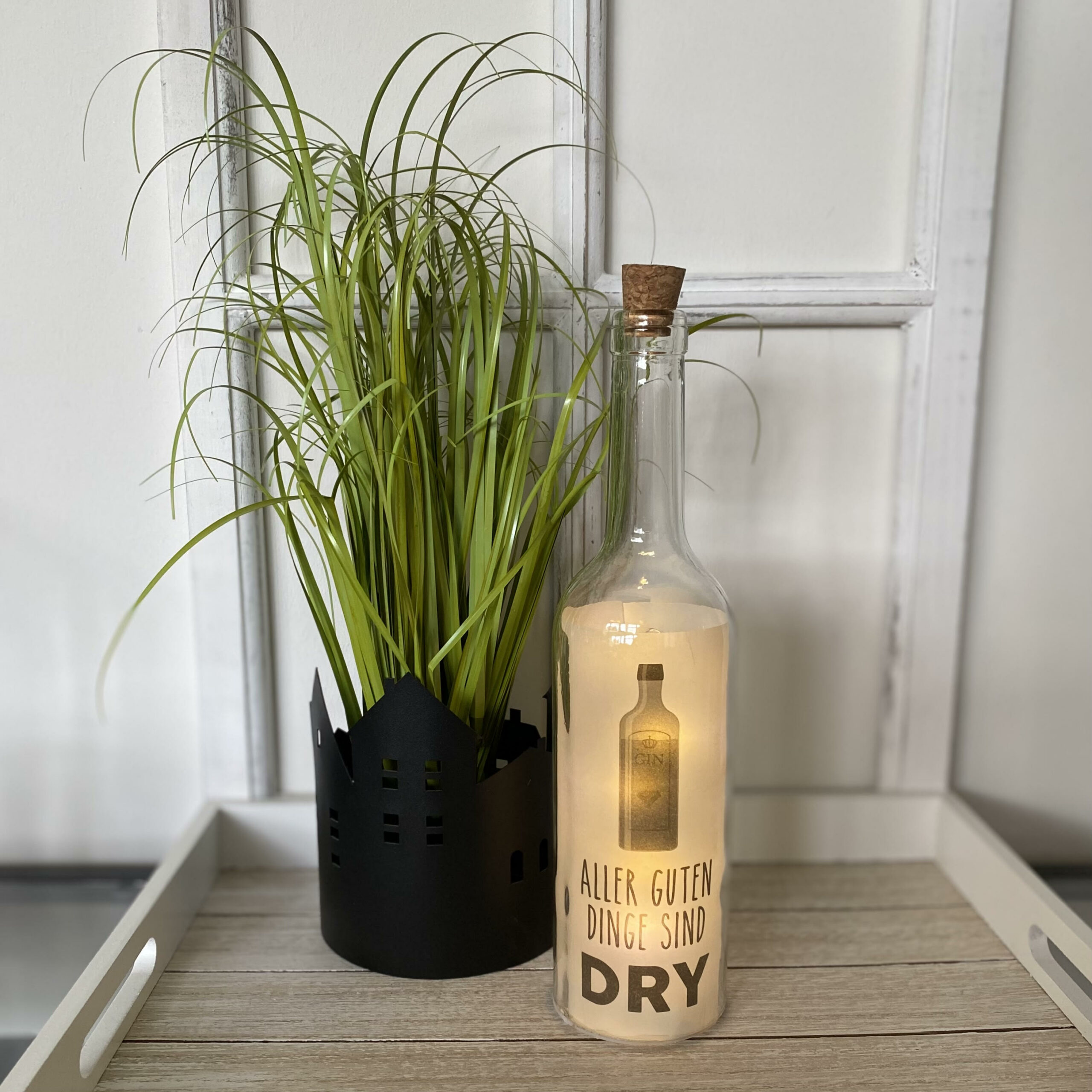 Glasflasche mit Spruch “ALLER GUTEN DINGE SIND DRY” mit 5erLED-Beleuchtung (Batteriefach)