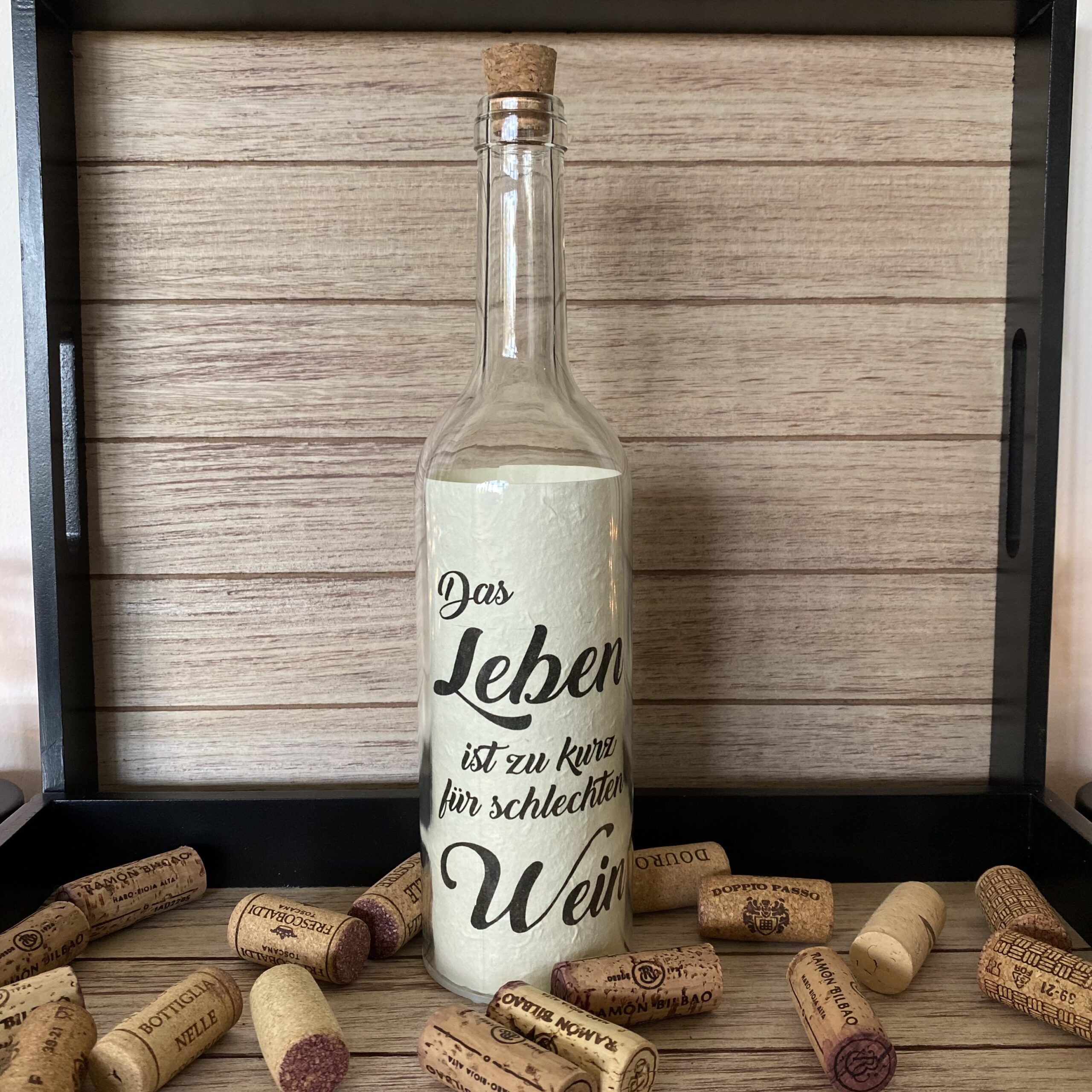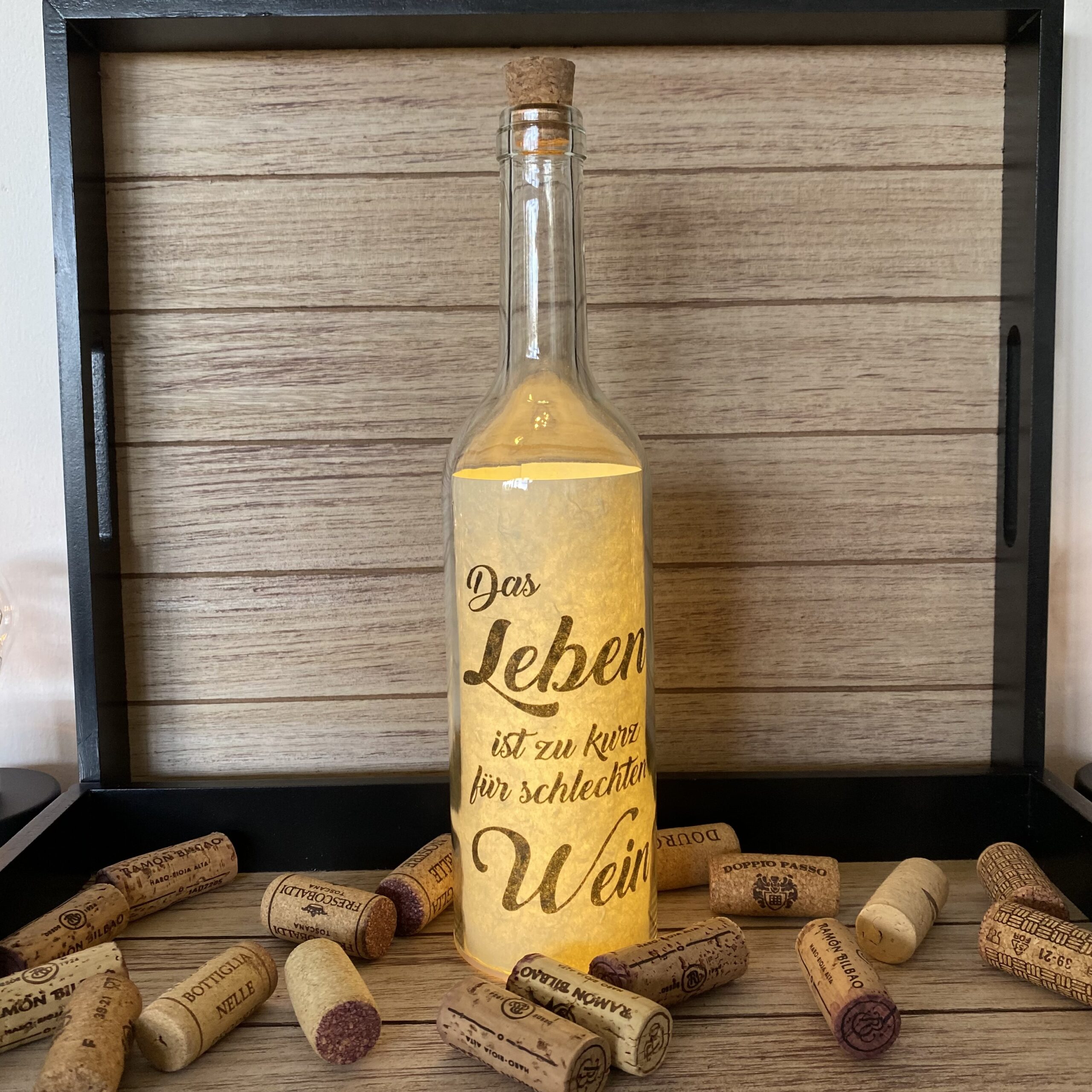 Glasflasche mit Spruch: “DAS LEBEN IST ZU KURZ FÜR SCHLECHTEN WEIN” mit 5er LED-Beleuchtung