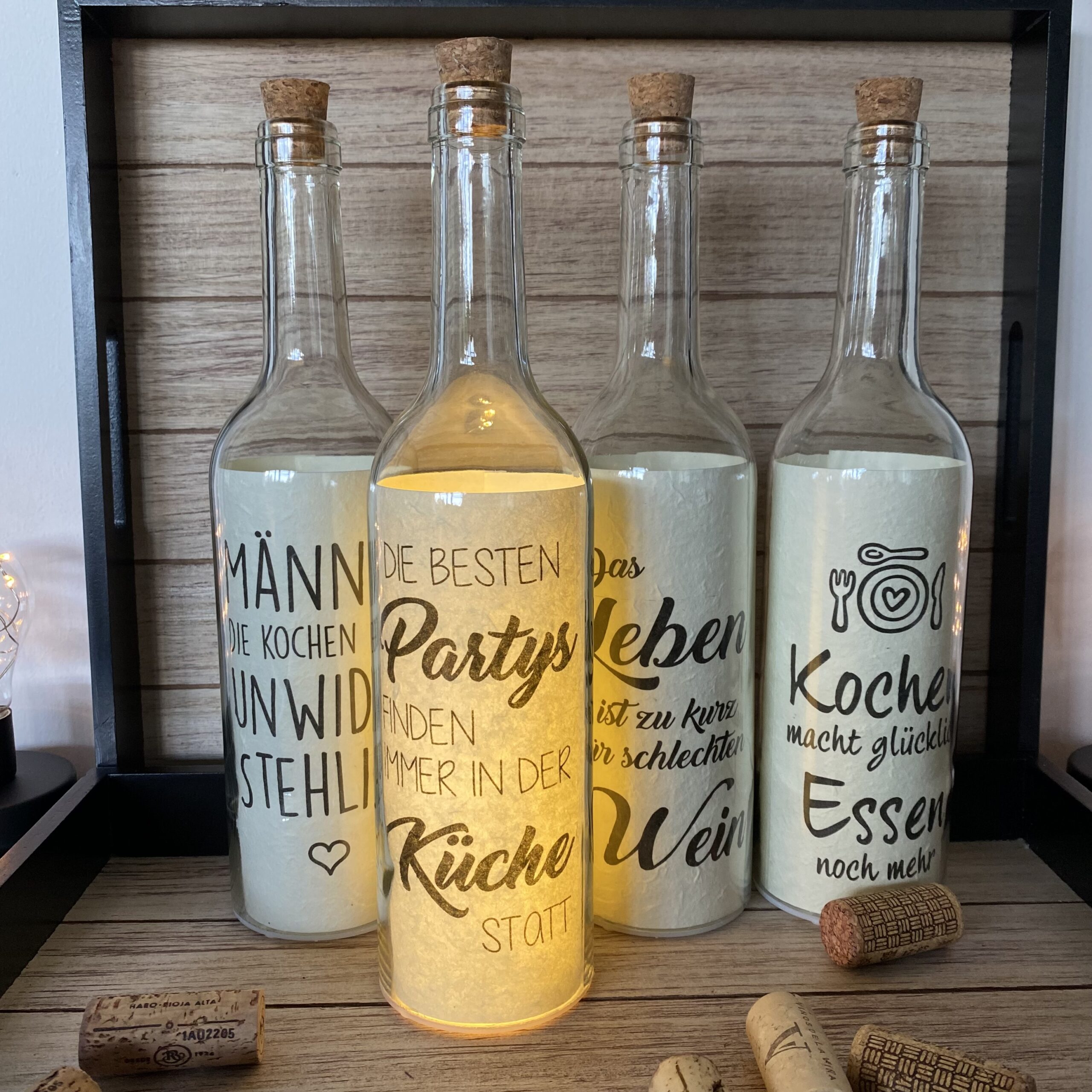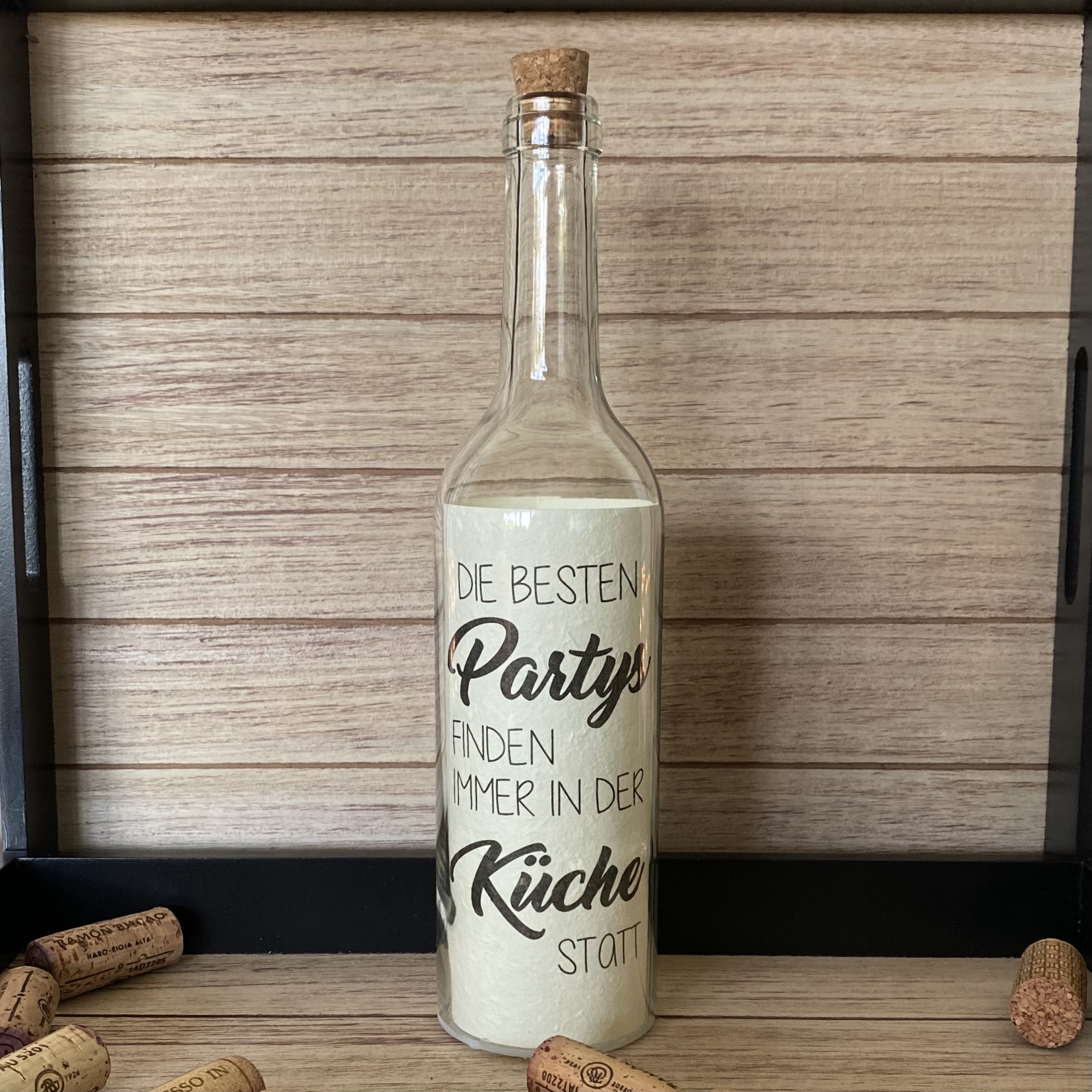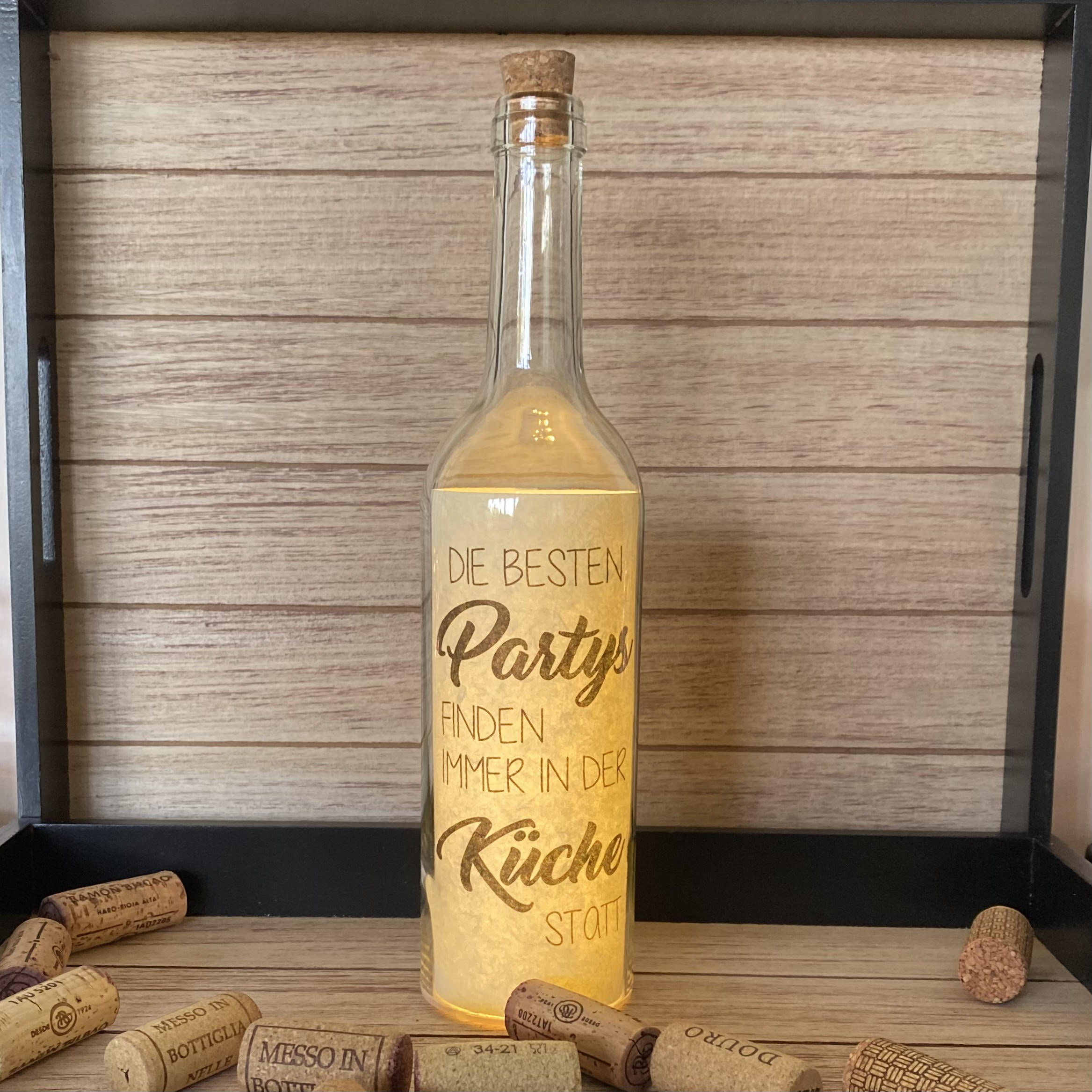 Glasflasche mit Spruch: “DIE BESTEN PARTYS FINDEN IN DER KÜCHE STATT” mit 5er LED-Beleuchtung