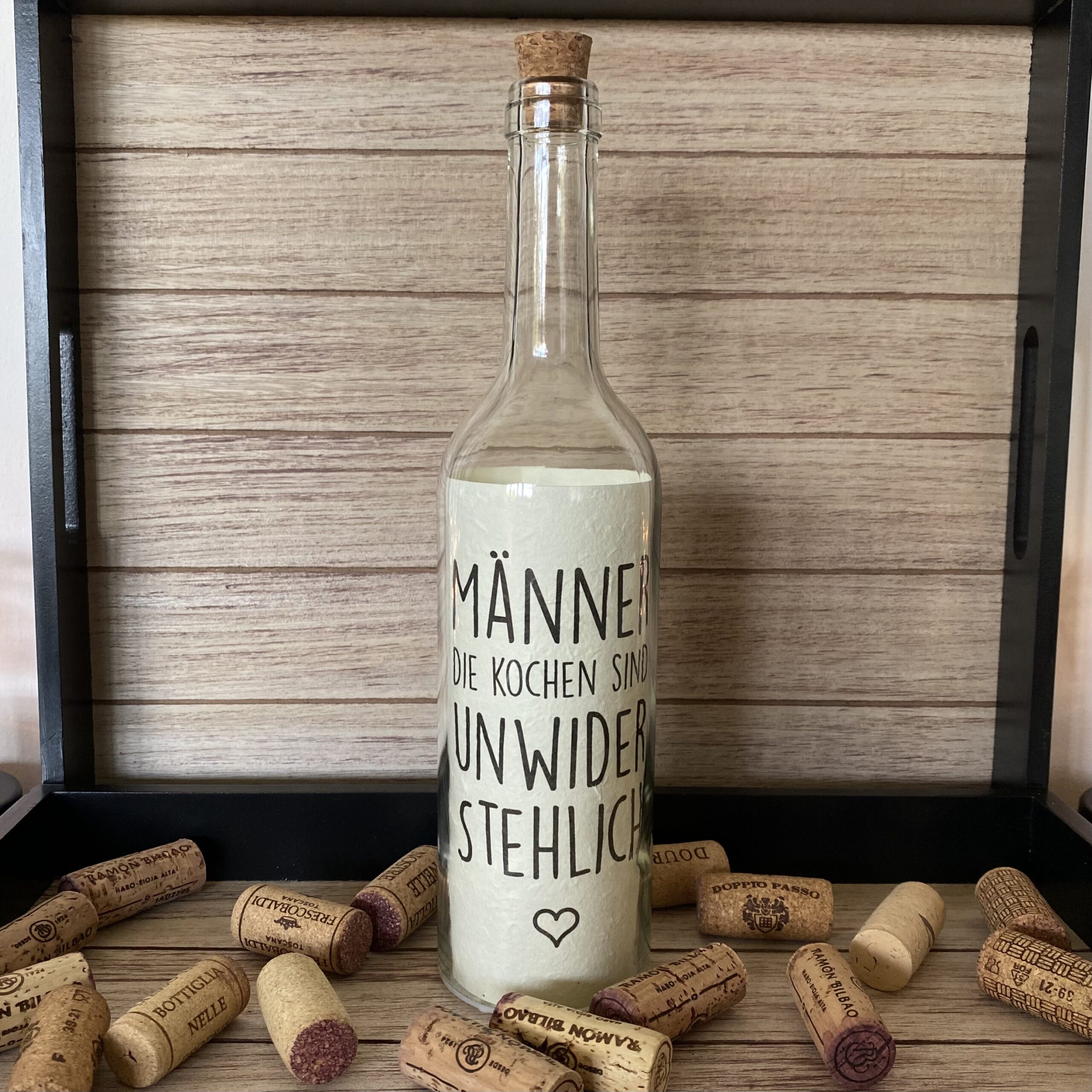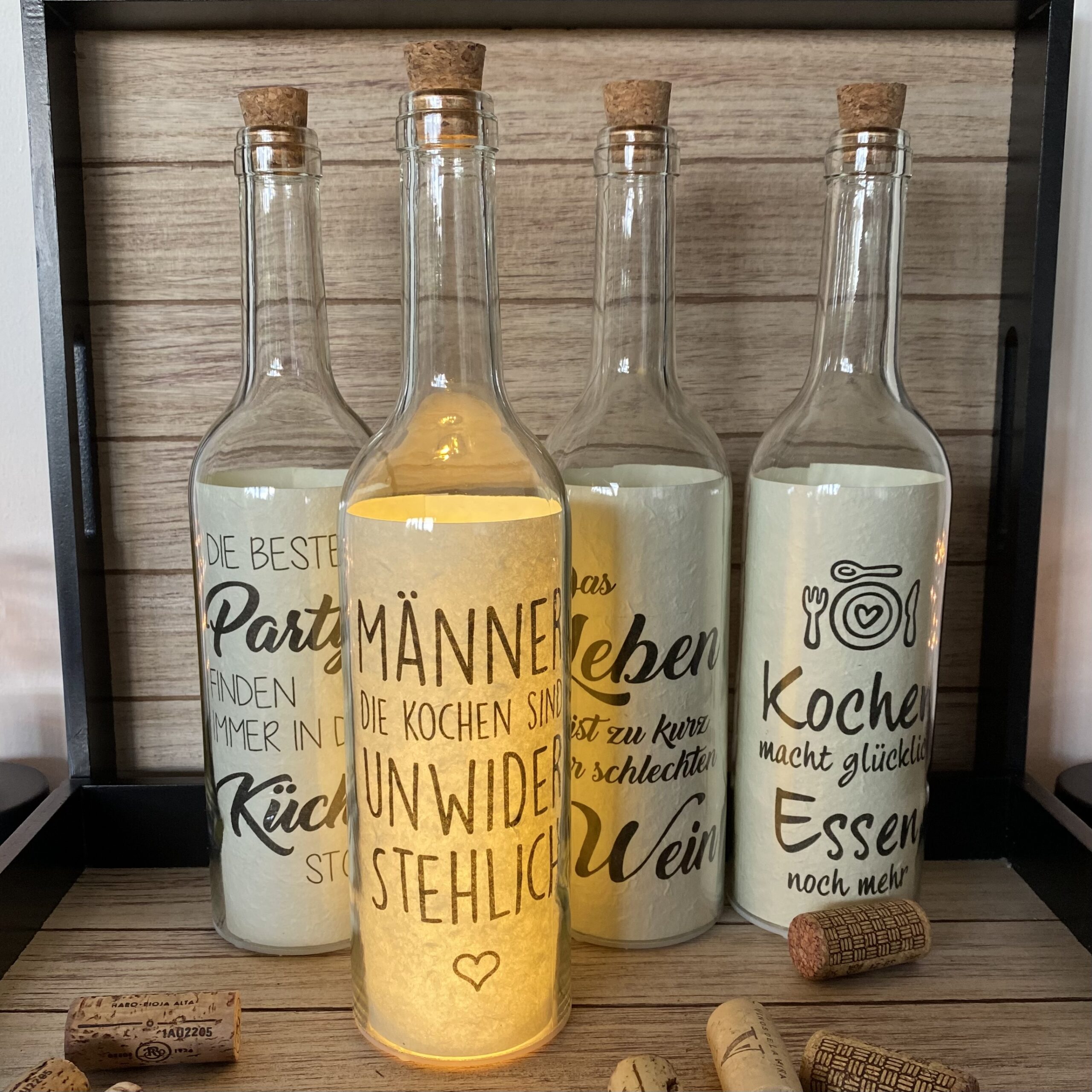 Glasflasche mit Spruch: “MÄNNER DIE KOCHEN SIND UNWIDERSTEHLICH” mit 5er LED-Beleuchtung