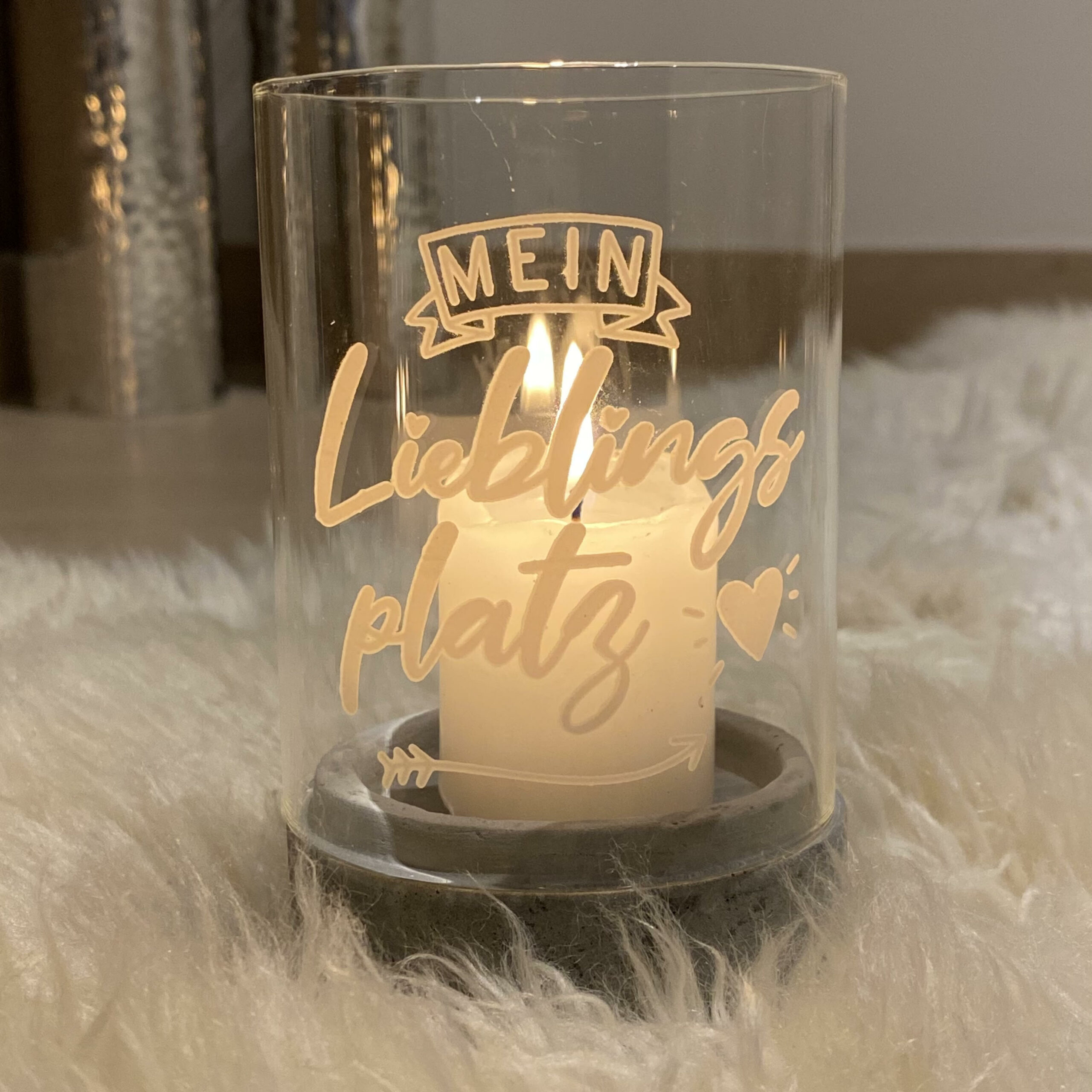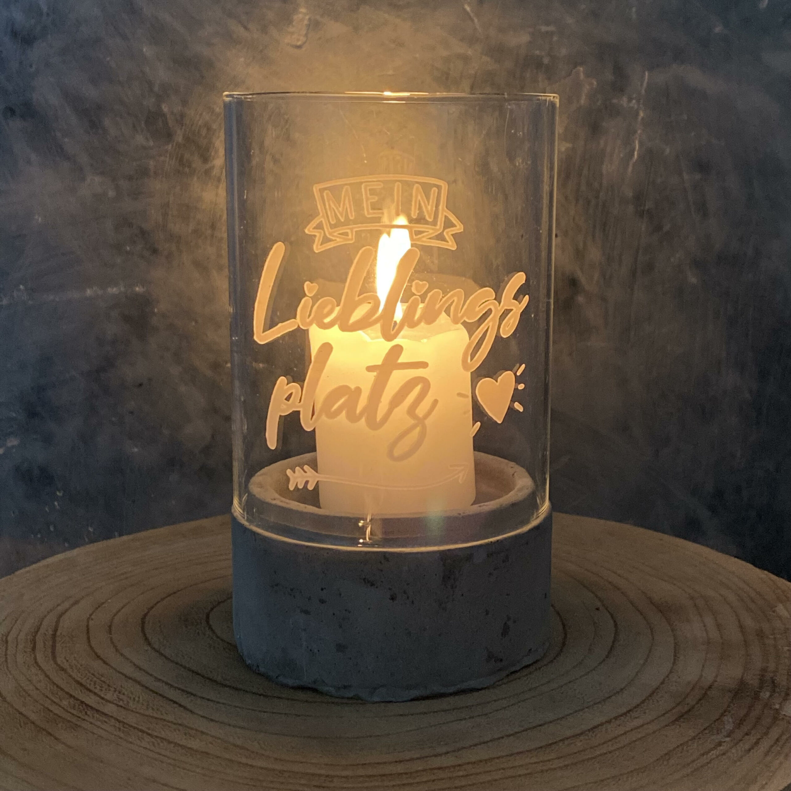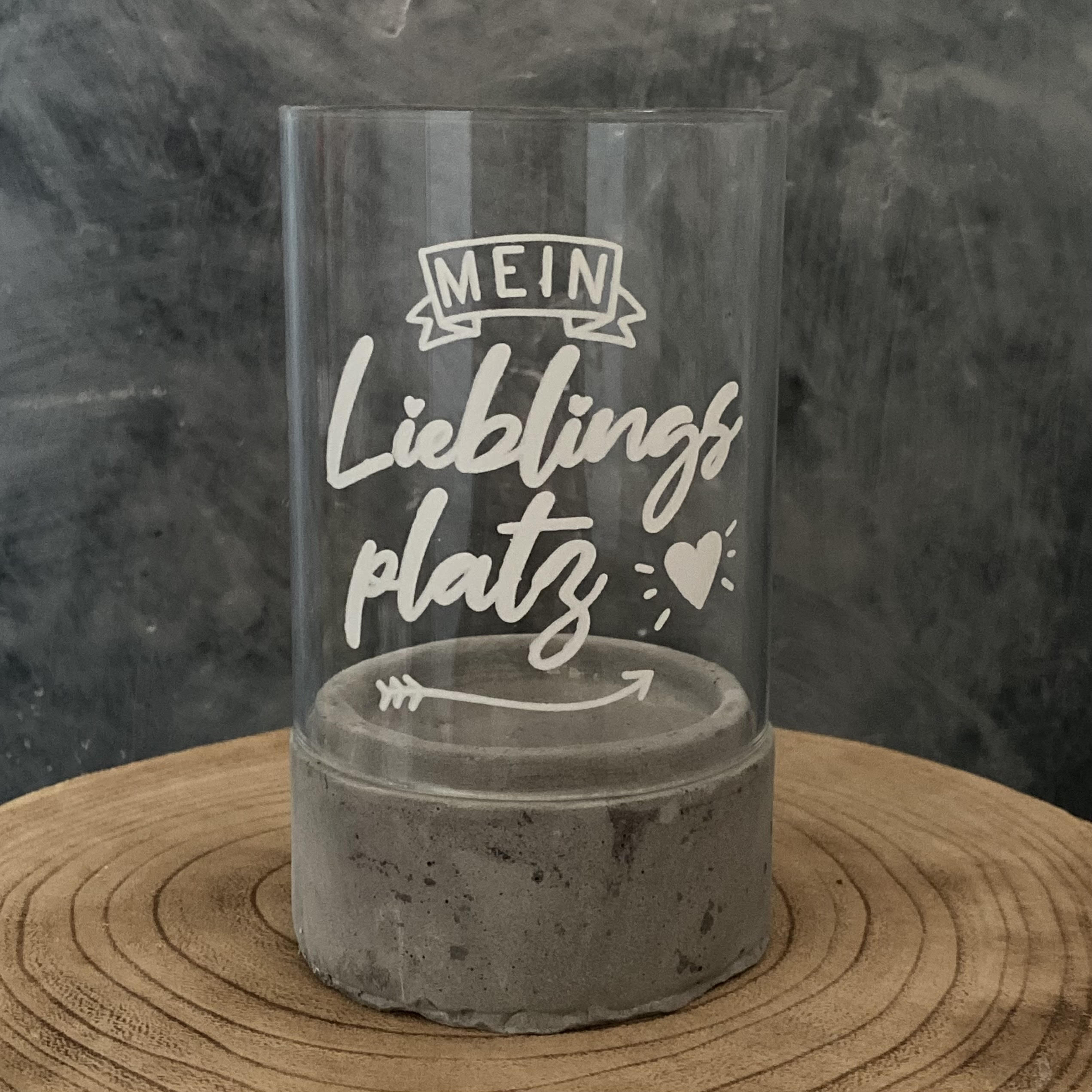 Glaswindlicht mit Spruch: “MEIN LIEBLINGSPLATZ” auf Zementsockel