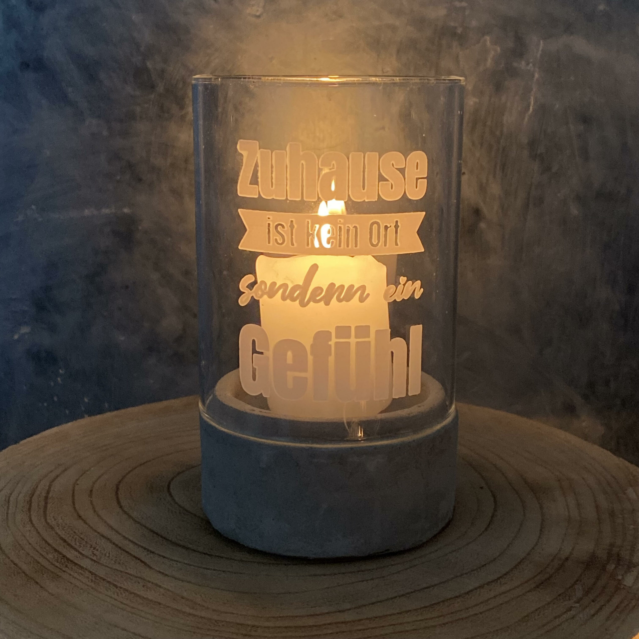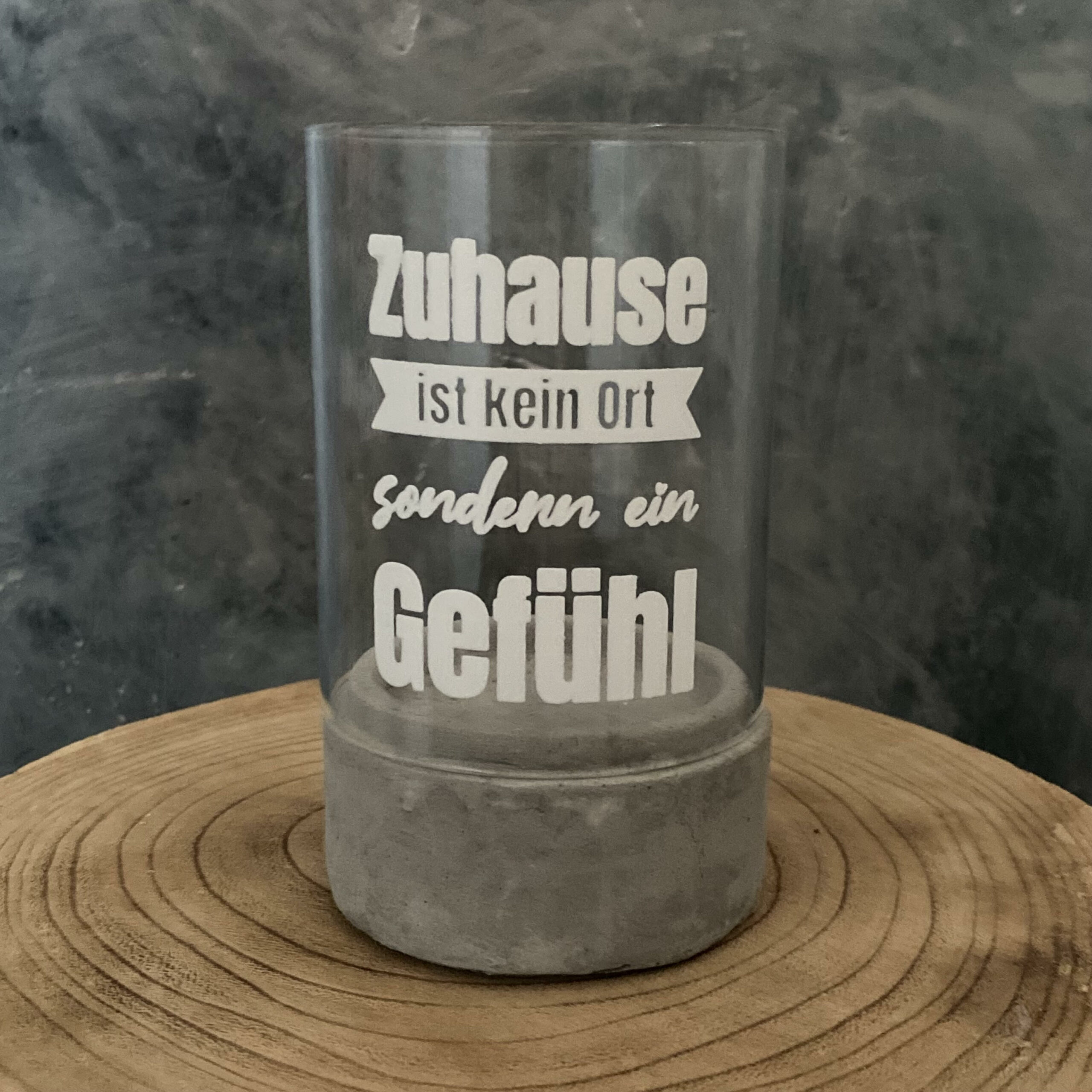 Glaswindlicht mit Spruch: “ZUHAUSE IST KEIN ORT, SONDERN…” auf Zementsockel