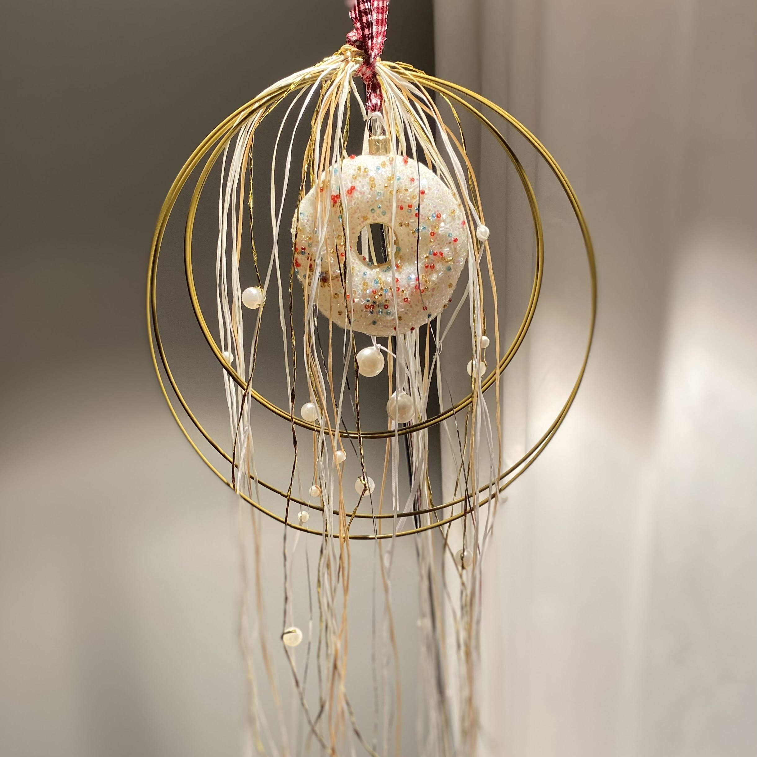 Goldener Dekoring mit drei Ringen und mit einer Glas-Weihnachskugel “Donut” dekoriert sowie gold-silber-weiß-beigen Bändern und weißen Perlmuttperlen und ein rot-kariertes Band zum Aufhängen.