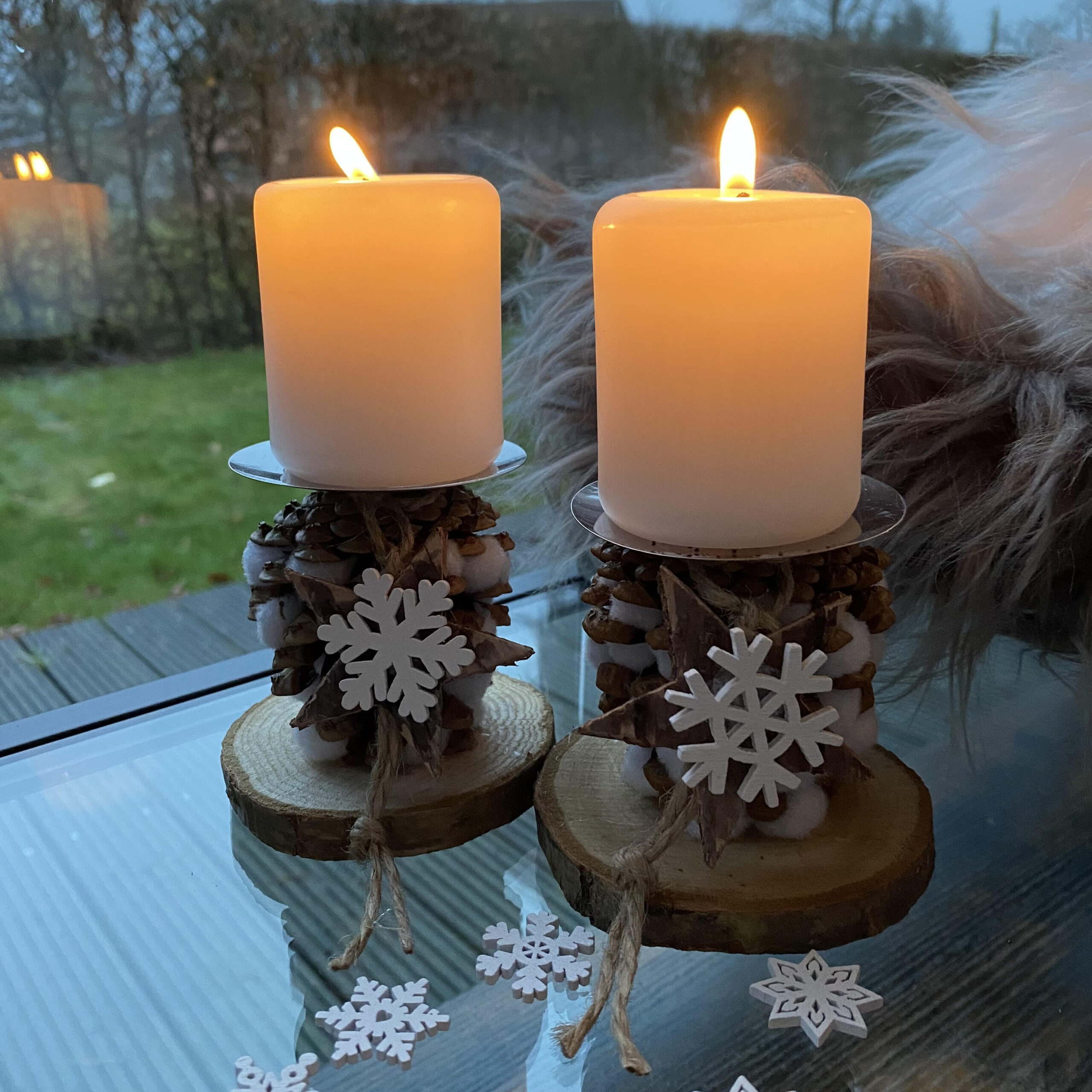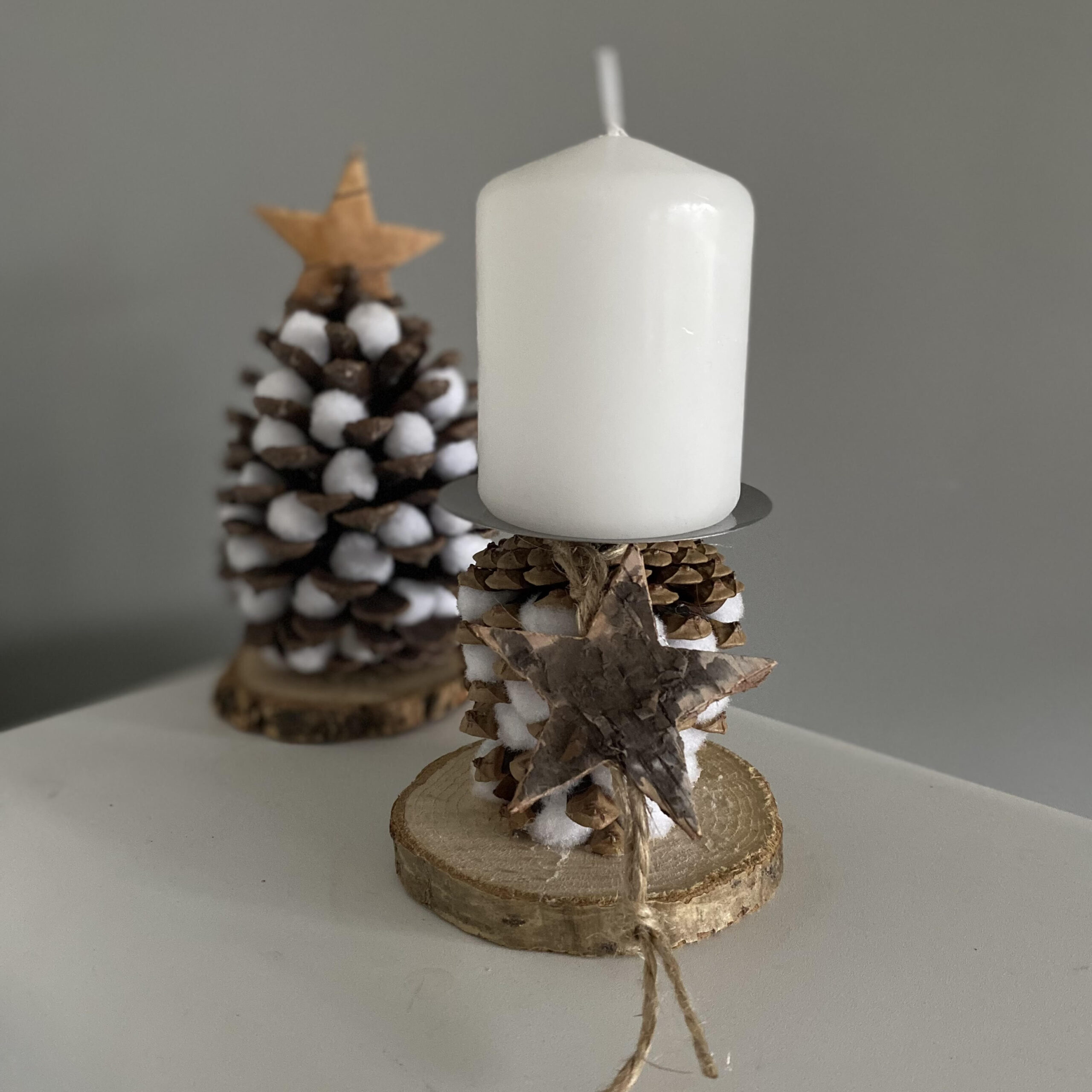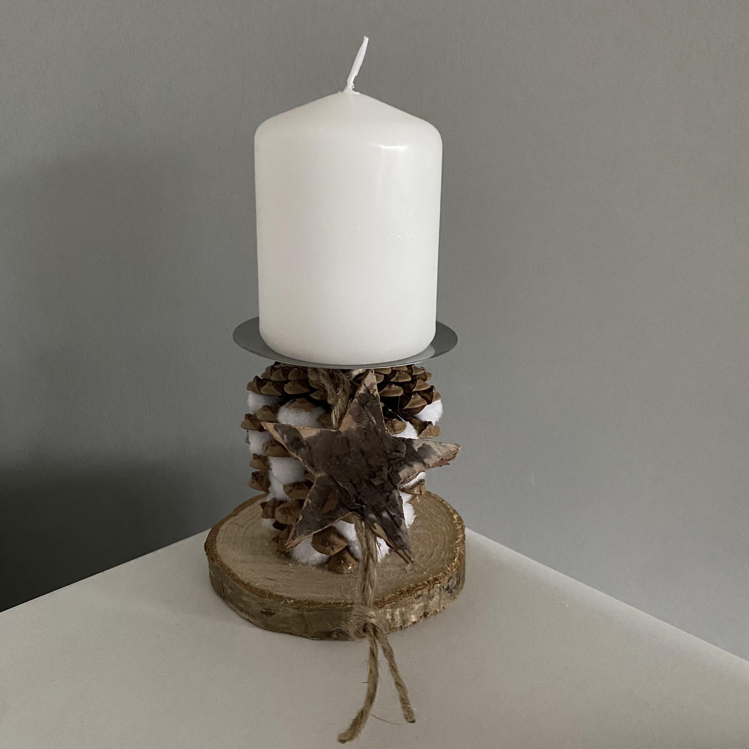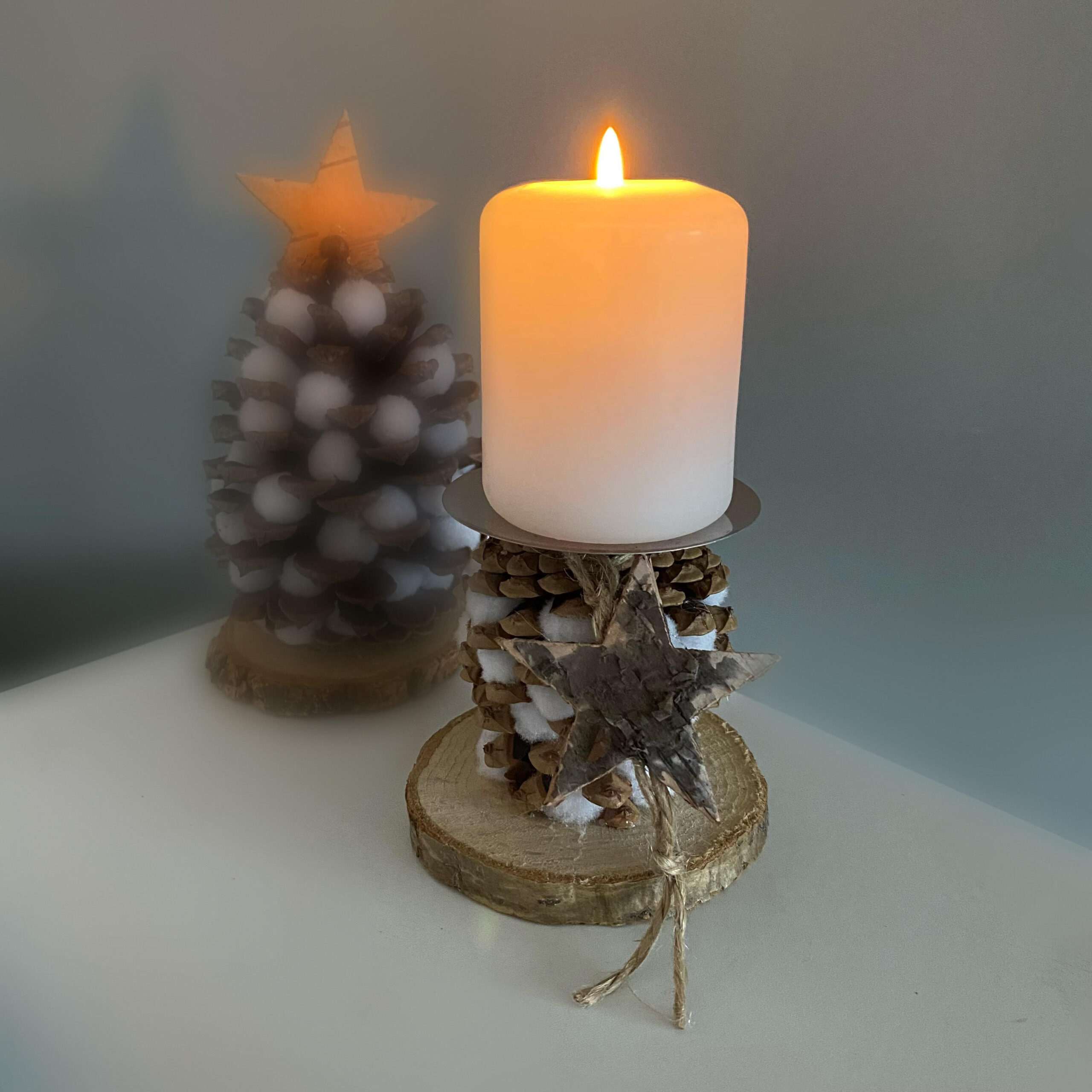 Selbstgemachter Kerzenhalter aus Kiefernzapfen mit silbernen Kerzenteller mit Dorn. Der Kiefernzapfen wurde verkehrt herum auf eine Baumscheibe geklebt und zusätzlich mit weißen Pompoms, als Schneekugeln und einem Stern-Anhänger aus Birkenholz verziert. Naturprodukt.