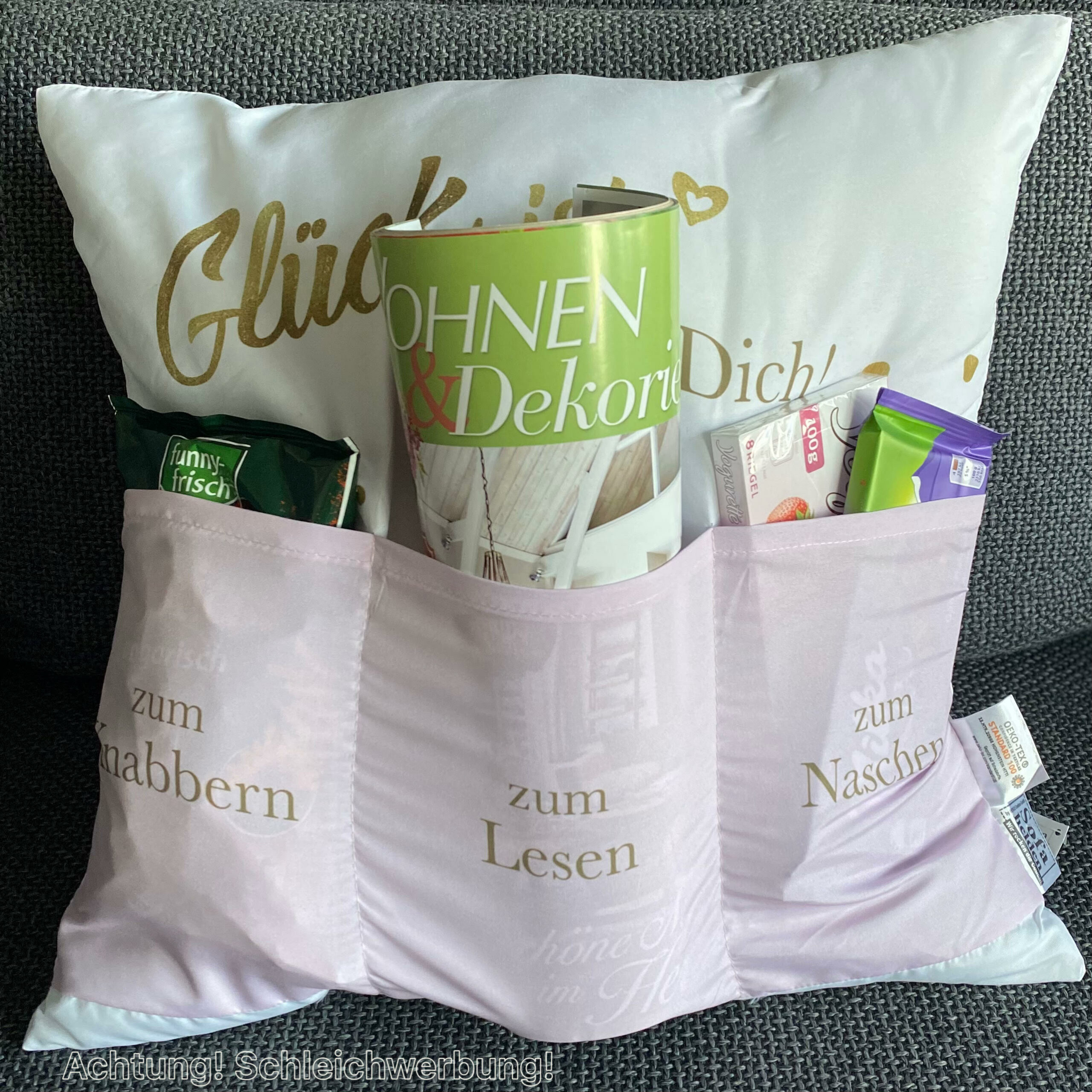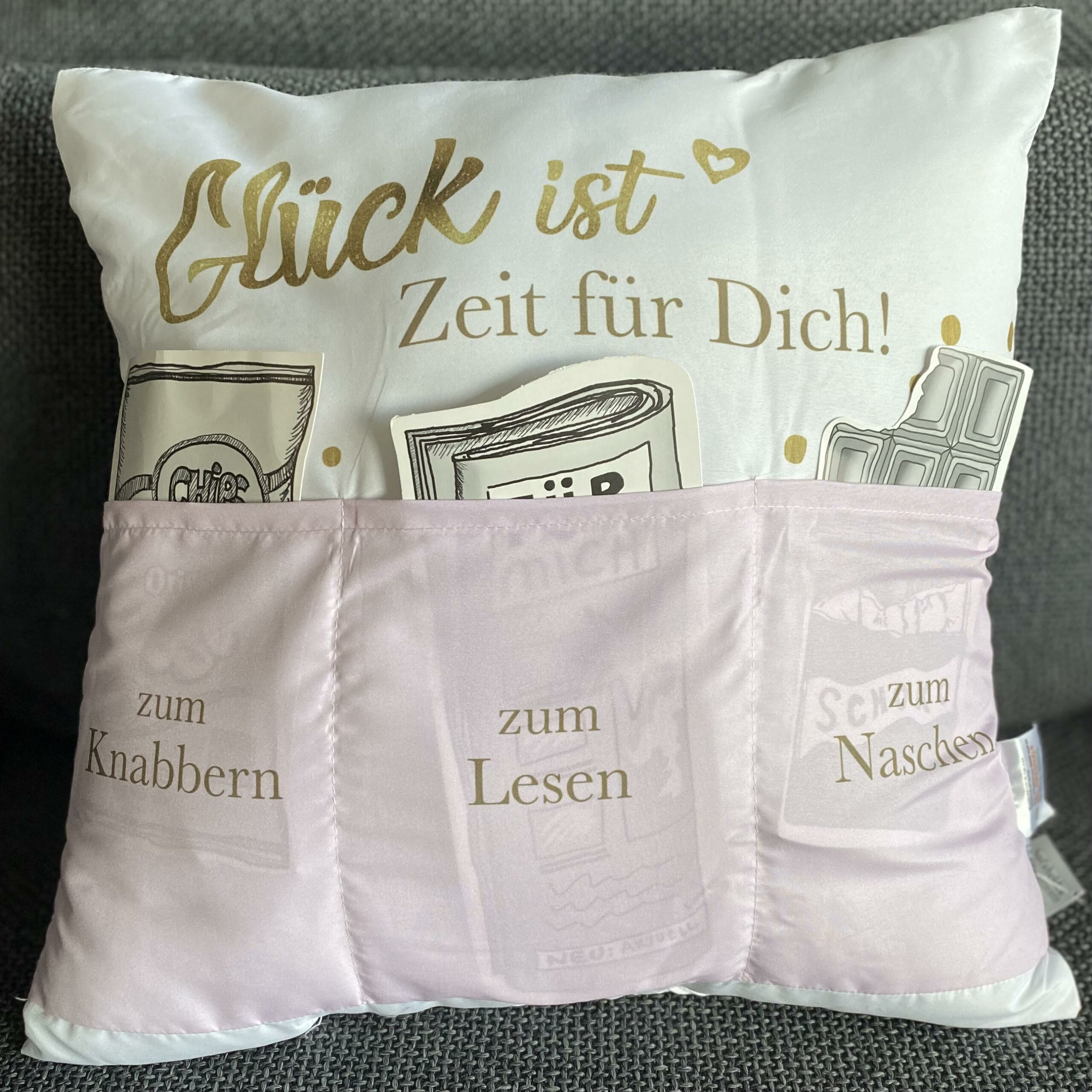 Kissen GLÜCK IST ZEIT FÜR DICH, mit drei Taschen zum Befüllen: ZUM KNABBERN, ZUM LESEN, ZUM NASCHEN.