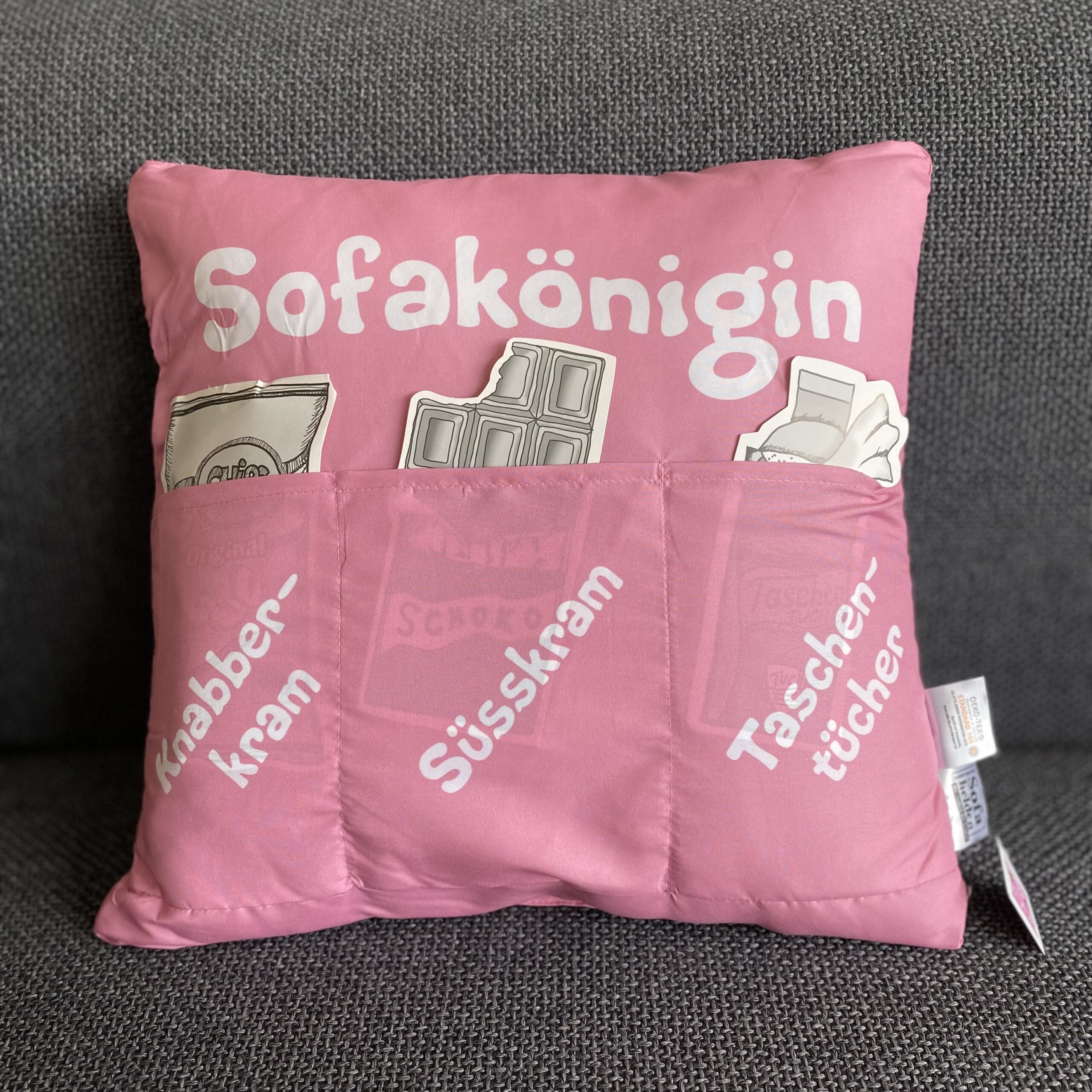 Kissen “SOFAKÖNIGIN” mit drei Taschen zum Befüllen: KNABBERKRAM, SÜSSKRAM, TASCHENTÜCHER