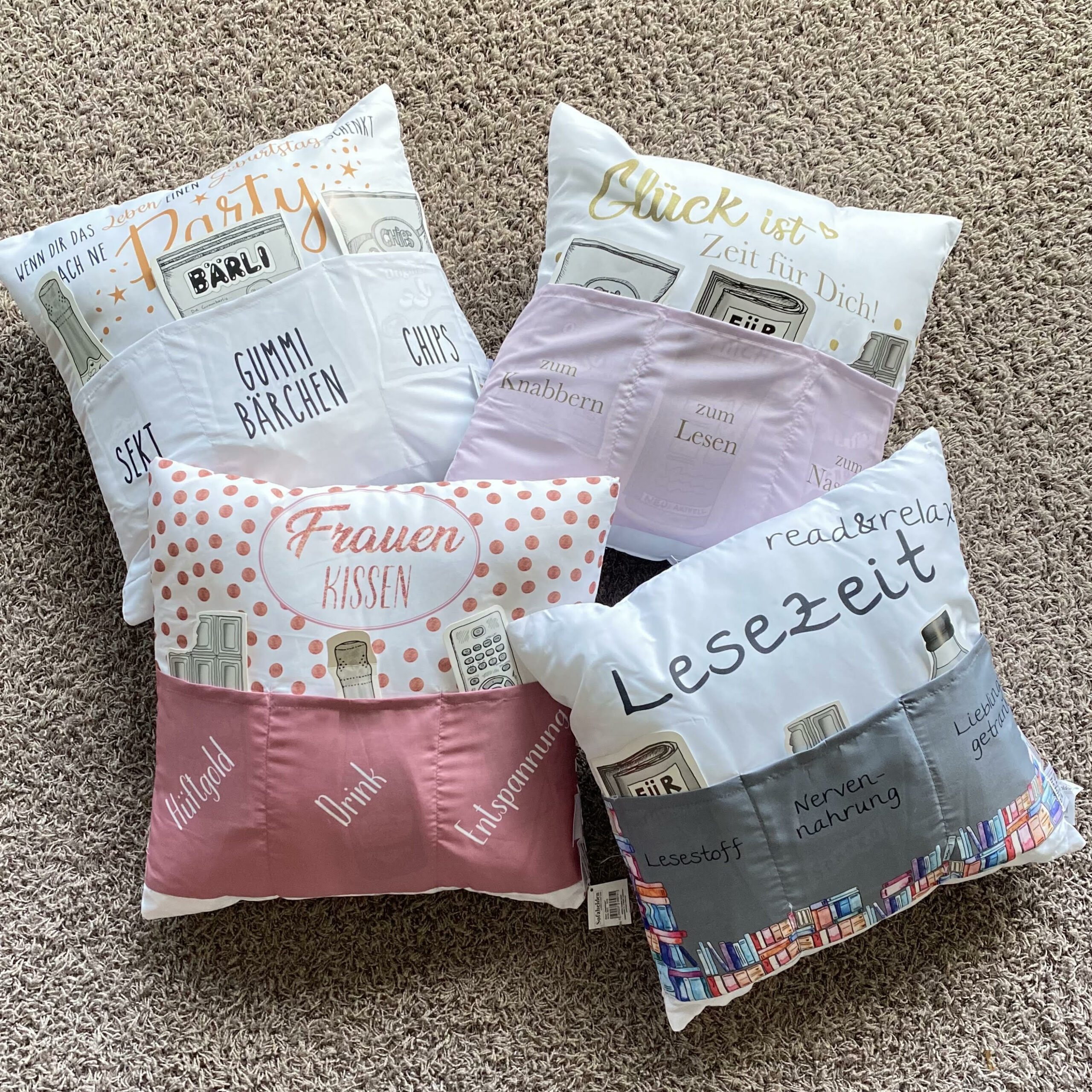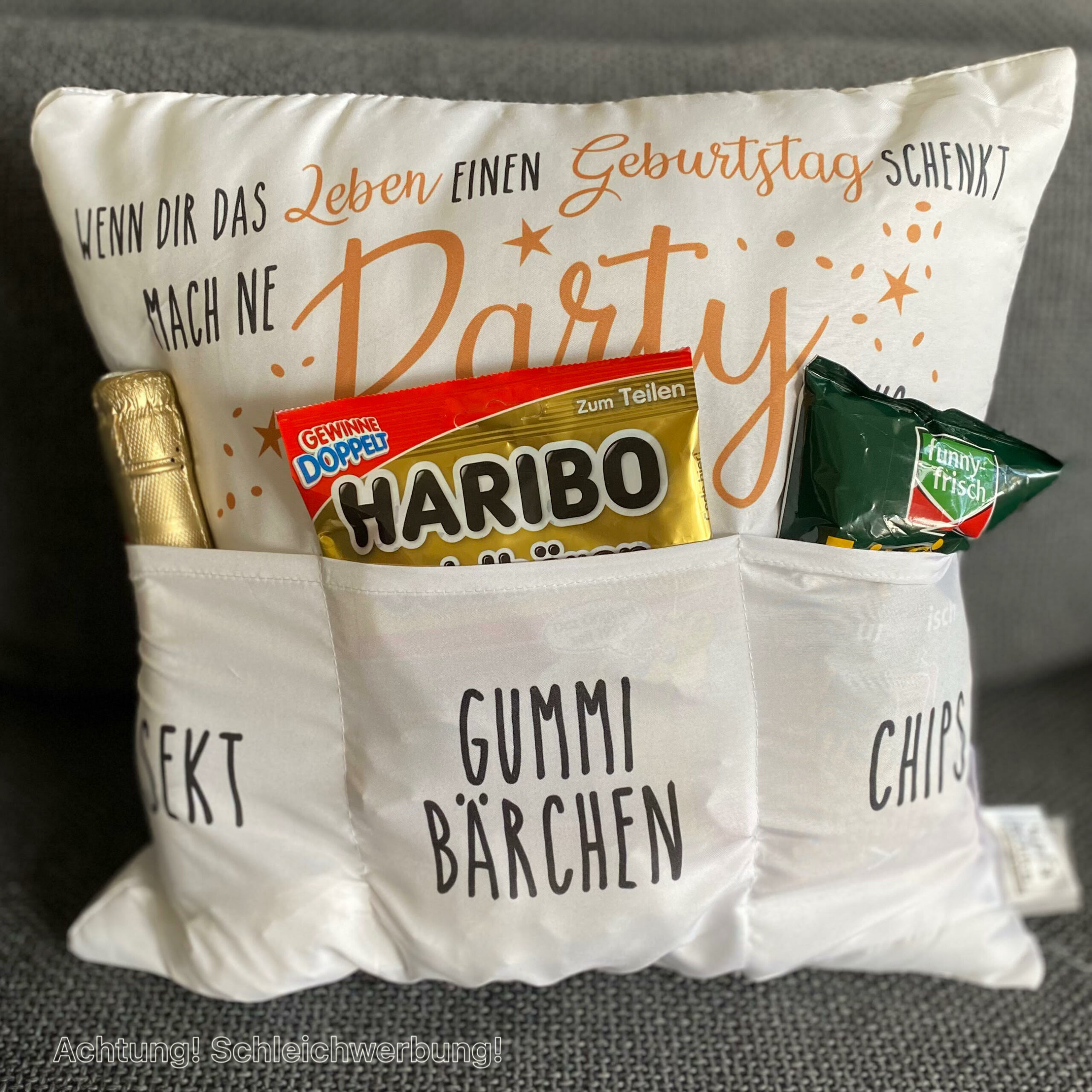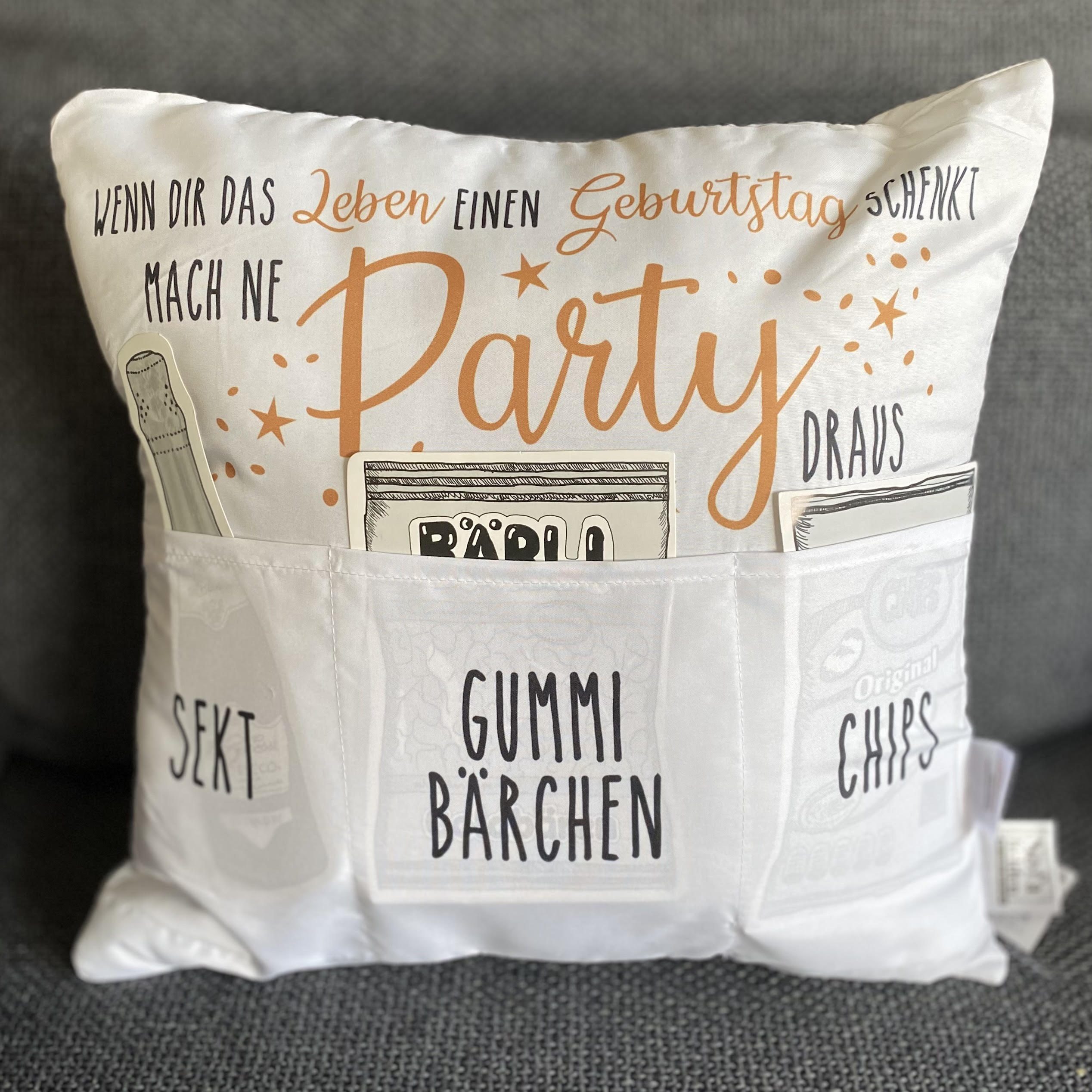 Kissen WENN DIR DAS LEBEN EINEN GEBURTSTAG SCHENKT, MACH NE PARTY DRAUS mit drei Taschen zum Befüllen: SEKT, GUMMIBÄRCHEN,CHIPS
