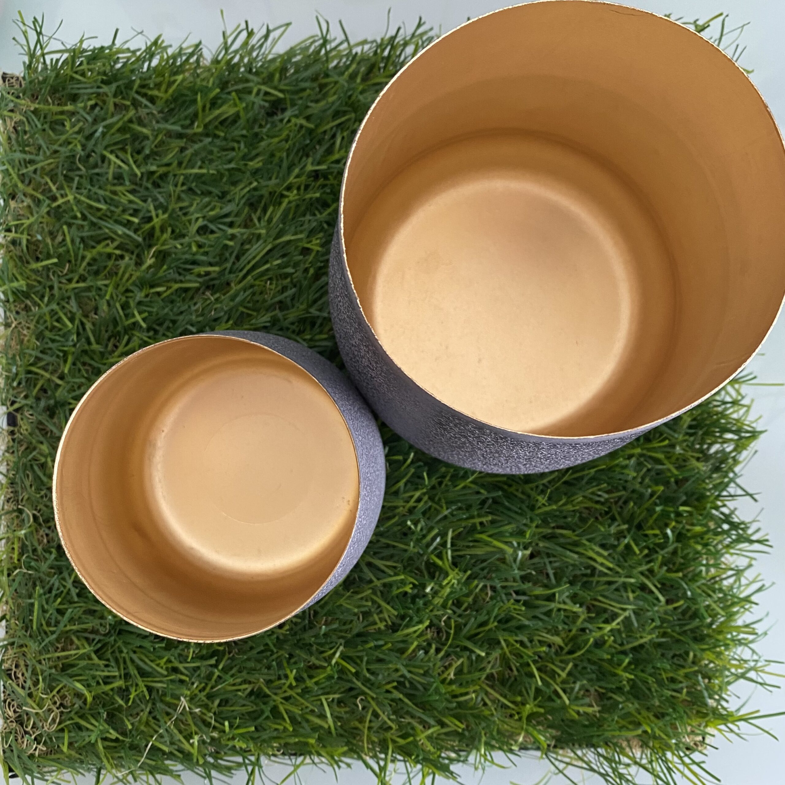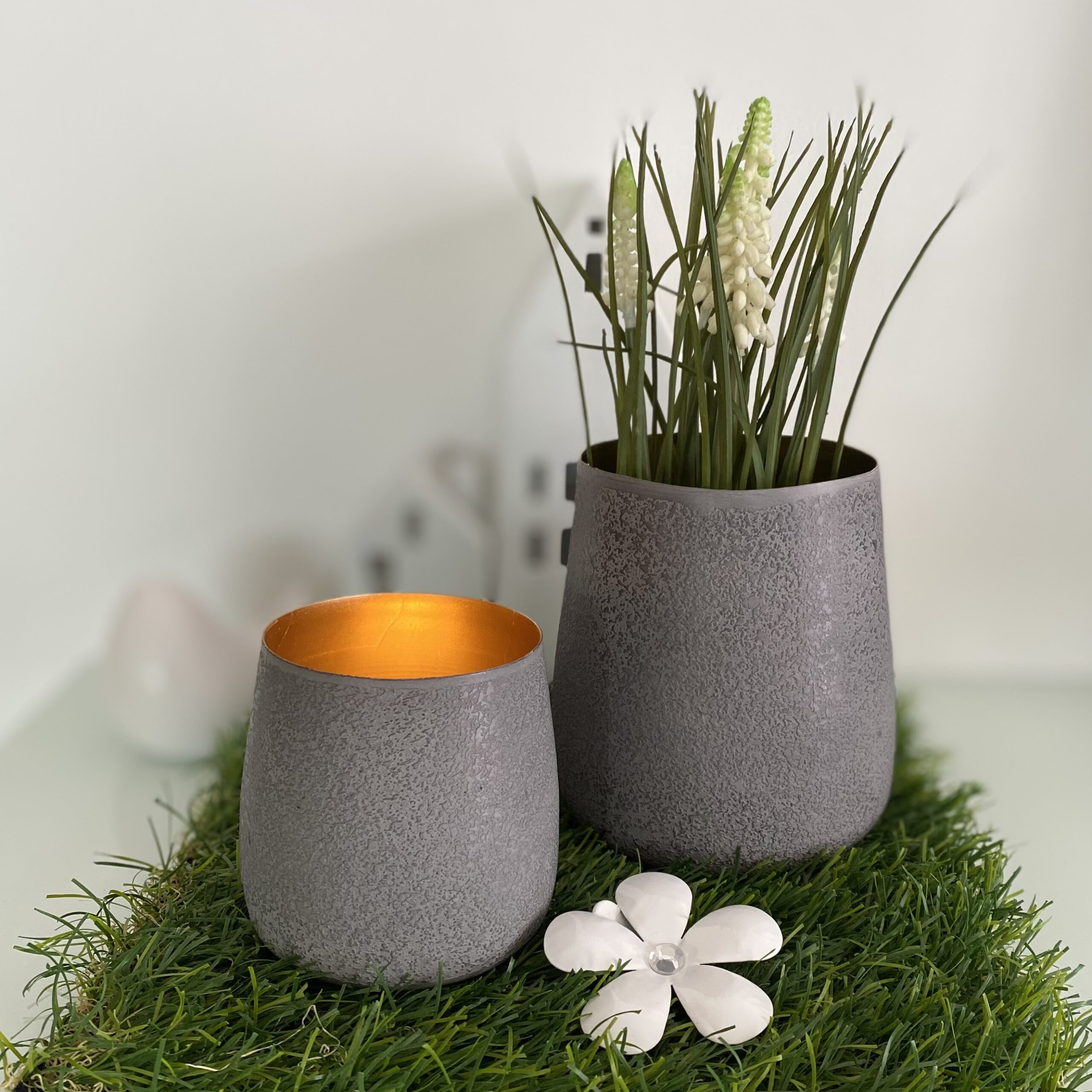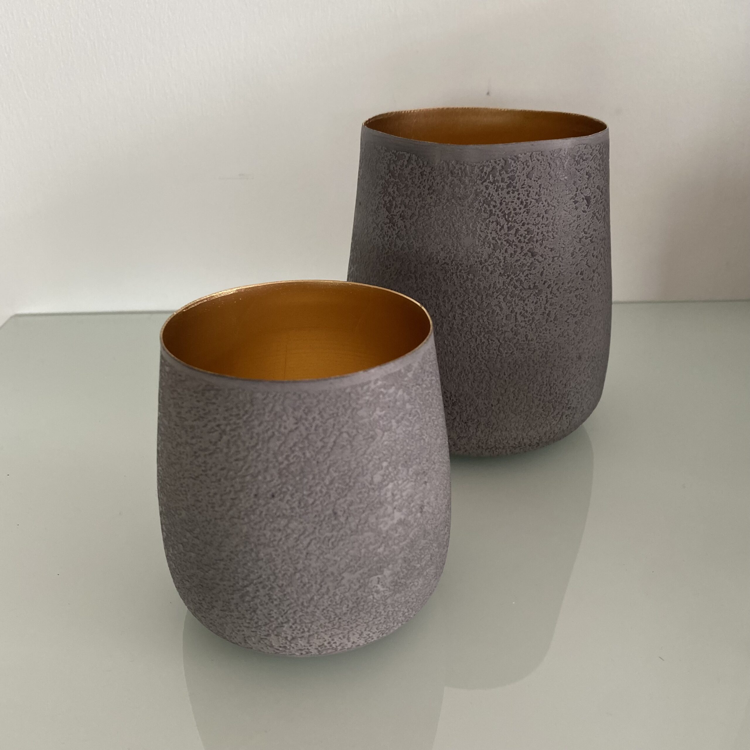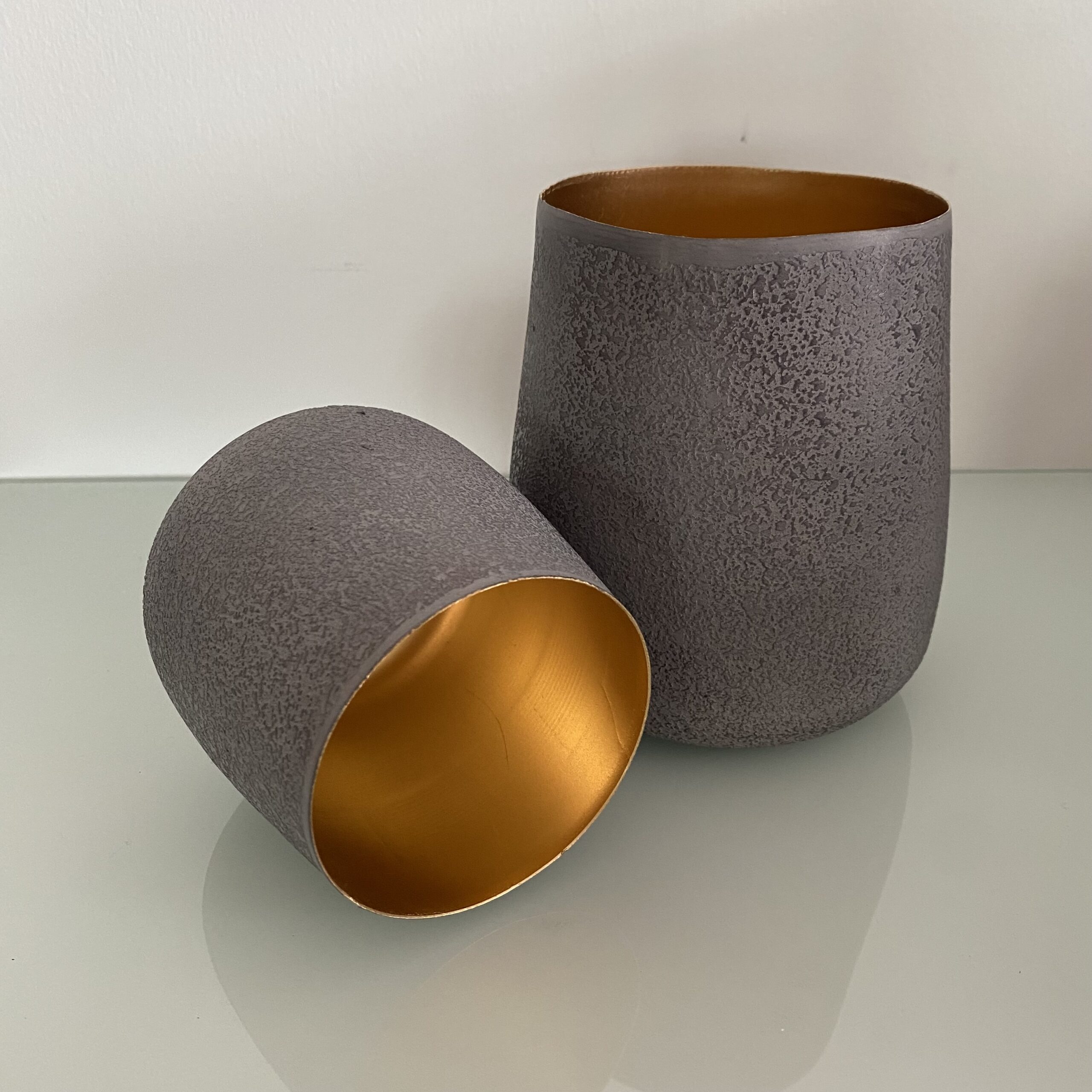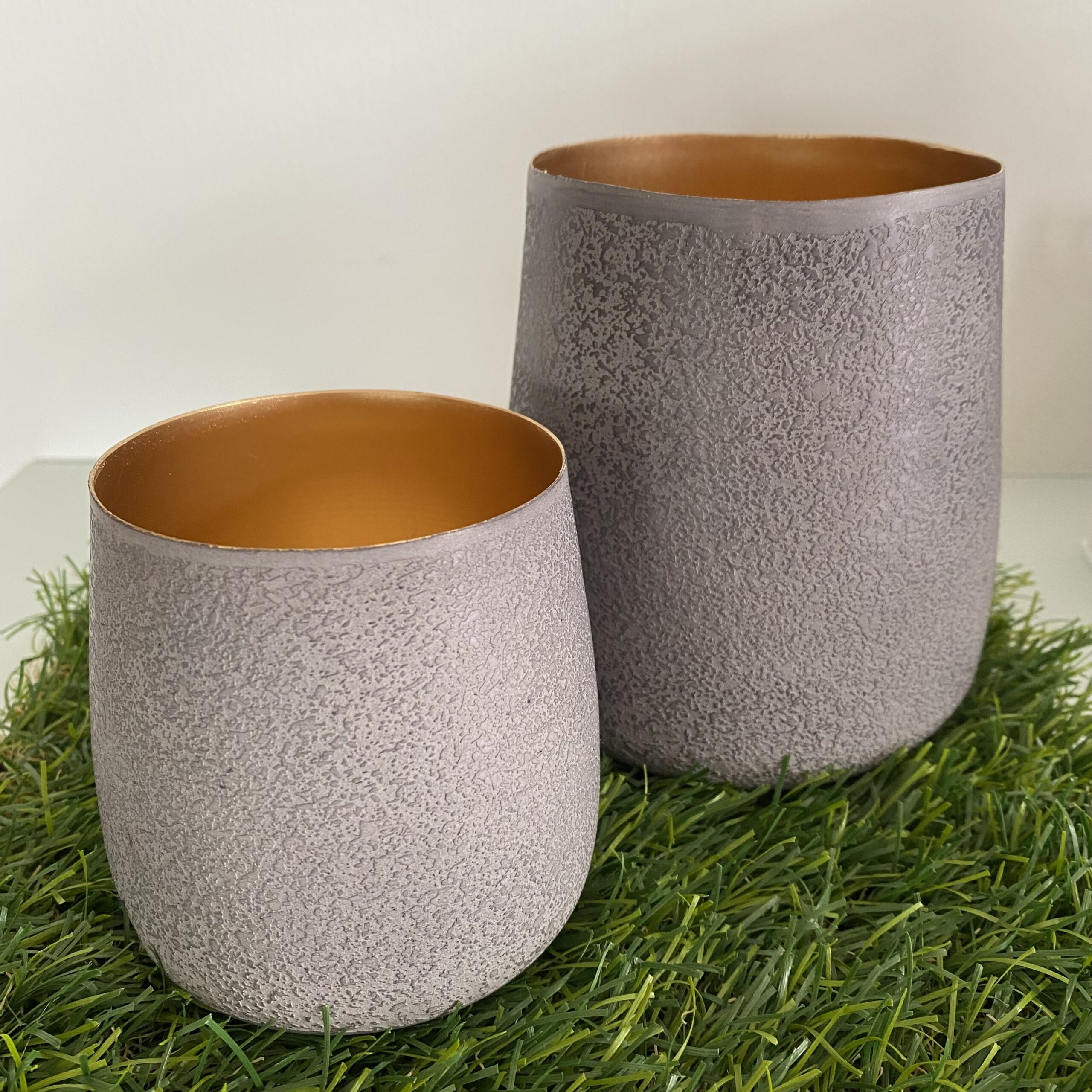 Cooles Metall-Windlicht-Set “ALBERT”, außen grau innen goldfarbend; ganzjährig einsetzbar.