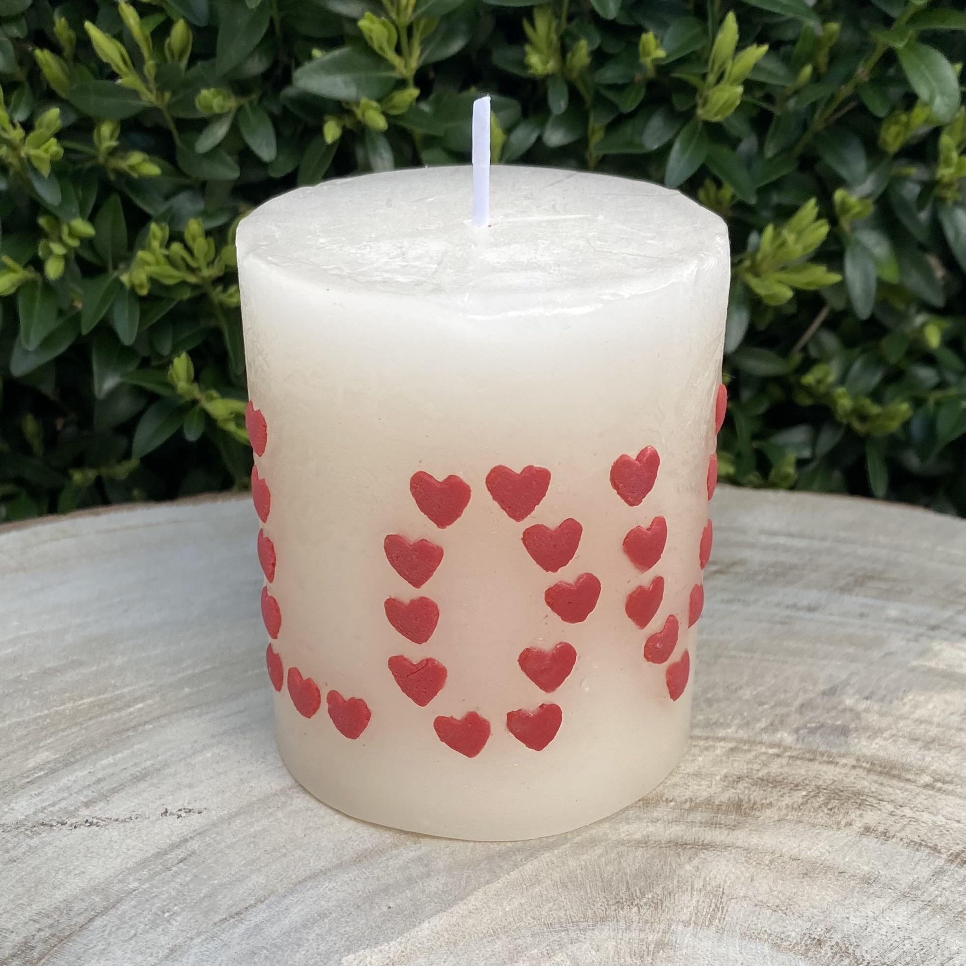 Mit roten Herzen handverzierte Kerze.