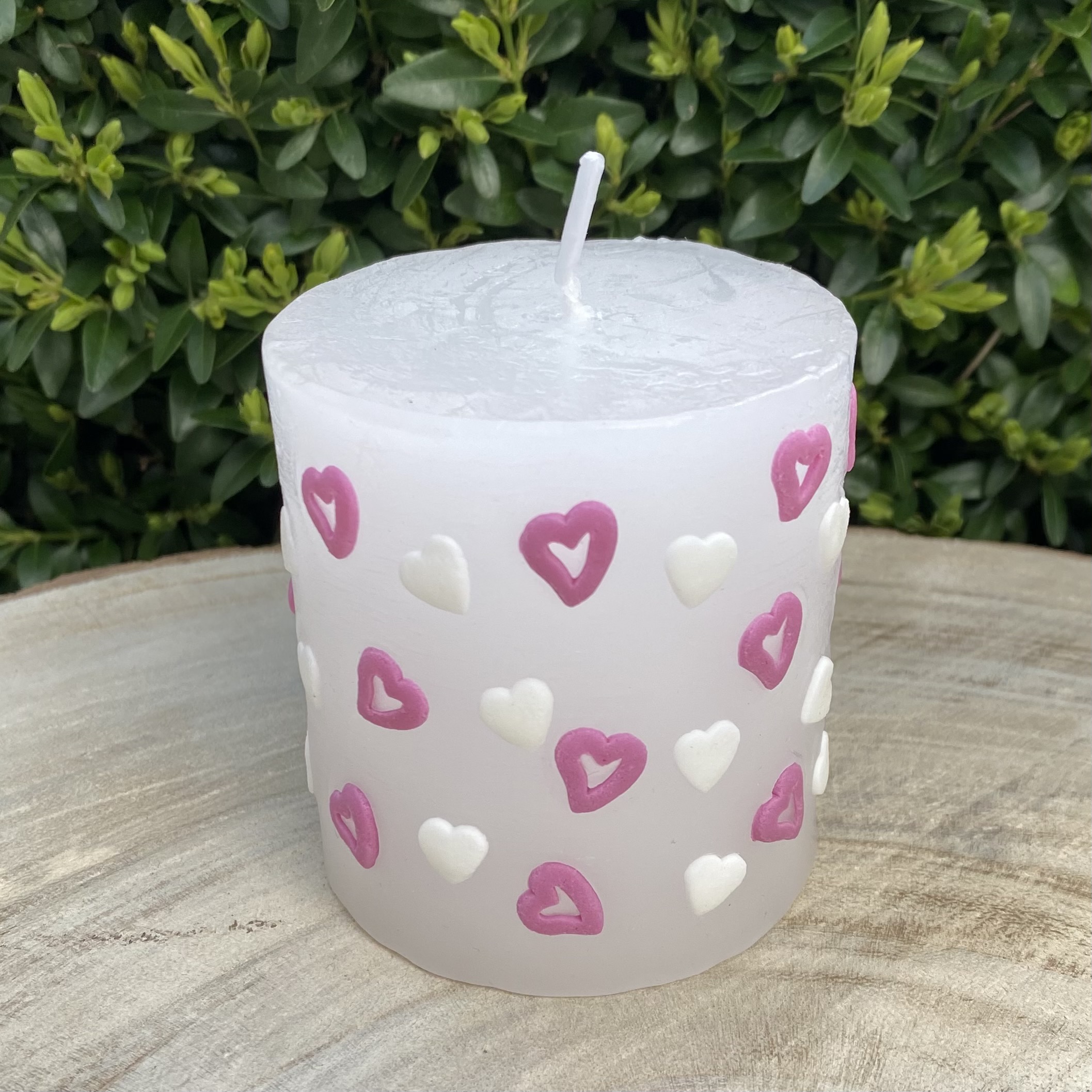 Mit roten Herzen handverzierte Kerze.