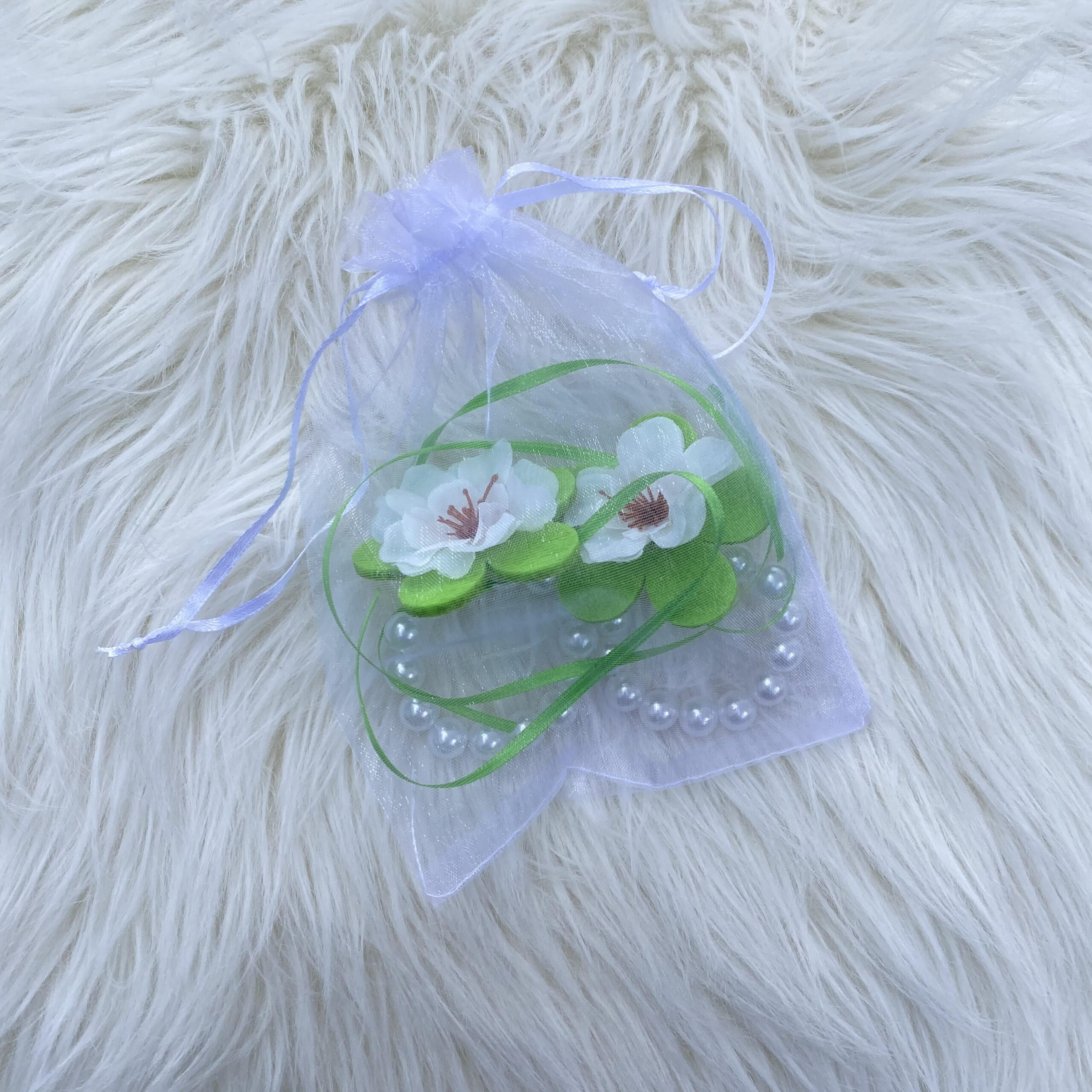 Die Serviettenringe werden in einem weißen Organzasäckchen geliefert.