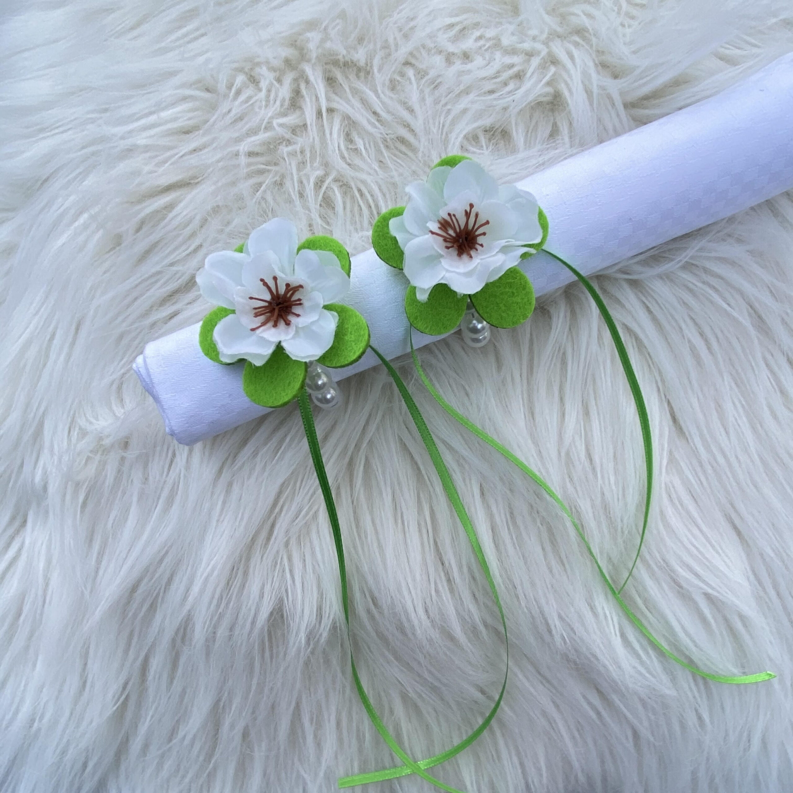 Serviettenringe aus Dekoperlen mit Filzblume und Kunstblüte sowie Satinbändchen.