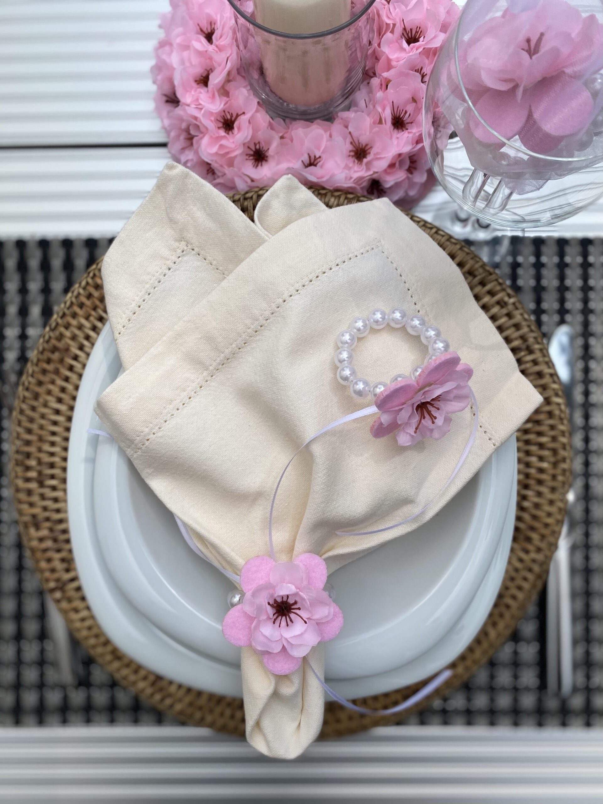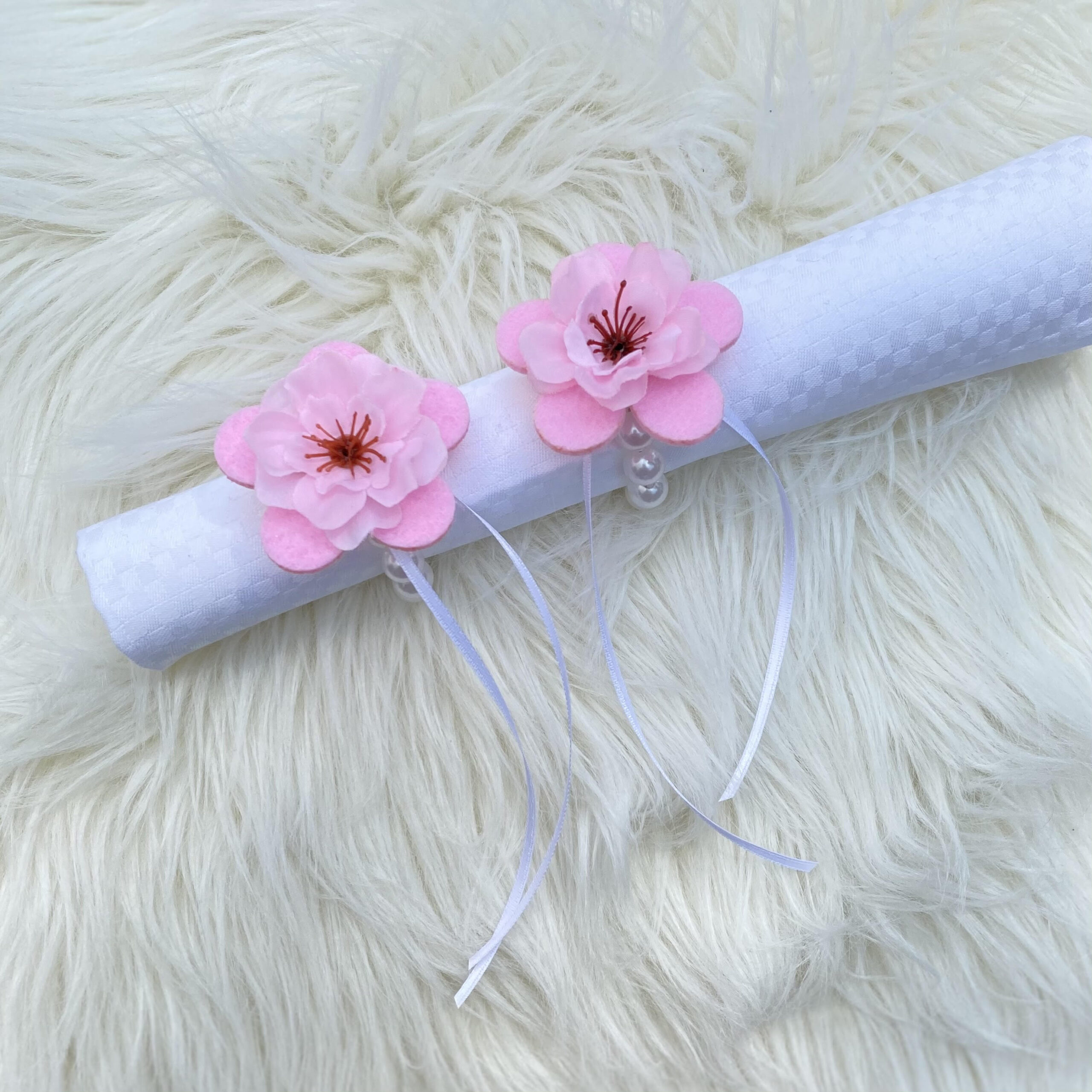 Serviettenringe aus Dekoperlen mit Filzblume und Kunstblüte sowie Satinbändchen.