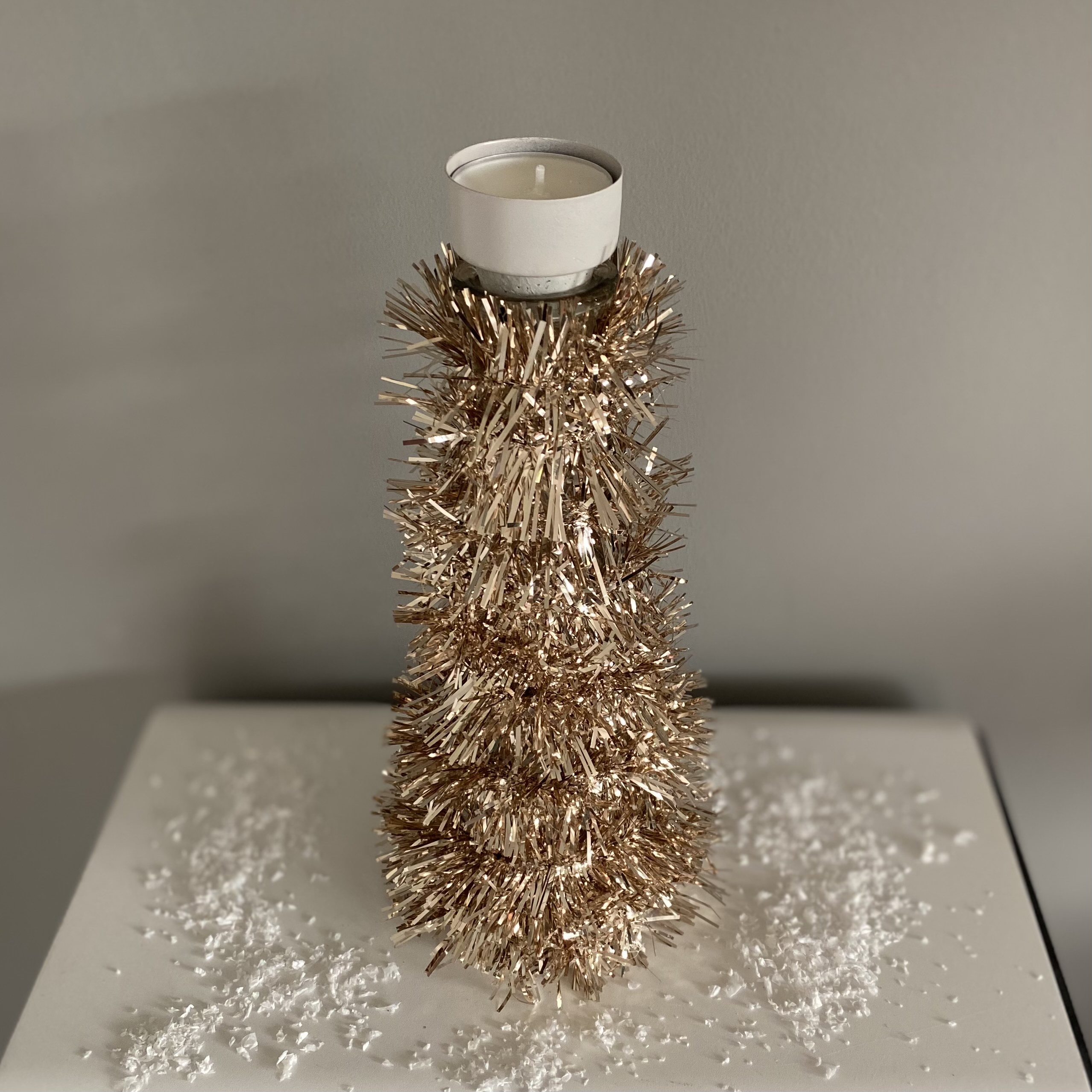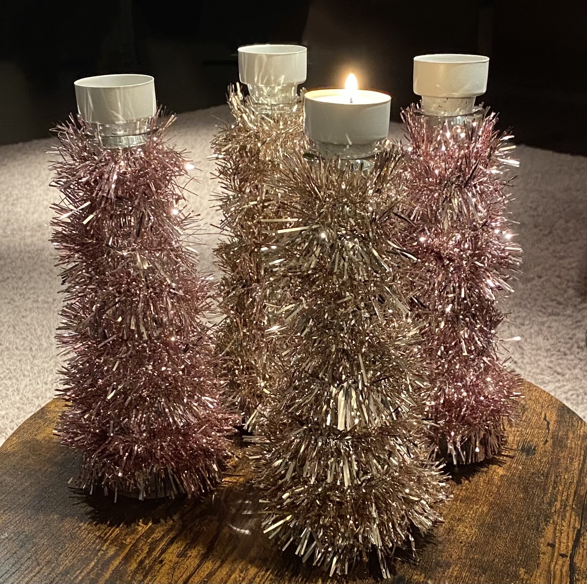 Handgefertiges Glitzertannenbäumchen: Glasflasche mit Dekogirlande verziert und einem Korkverschluss mit Teelichthalter.