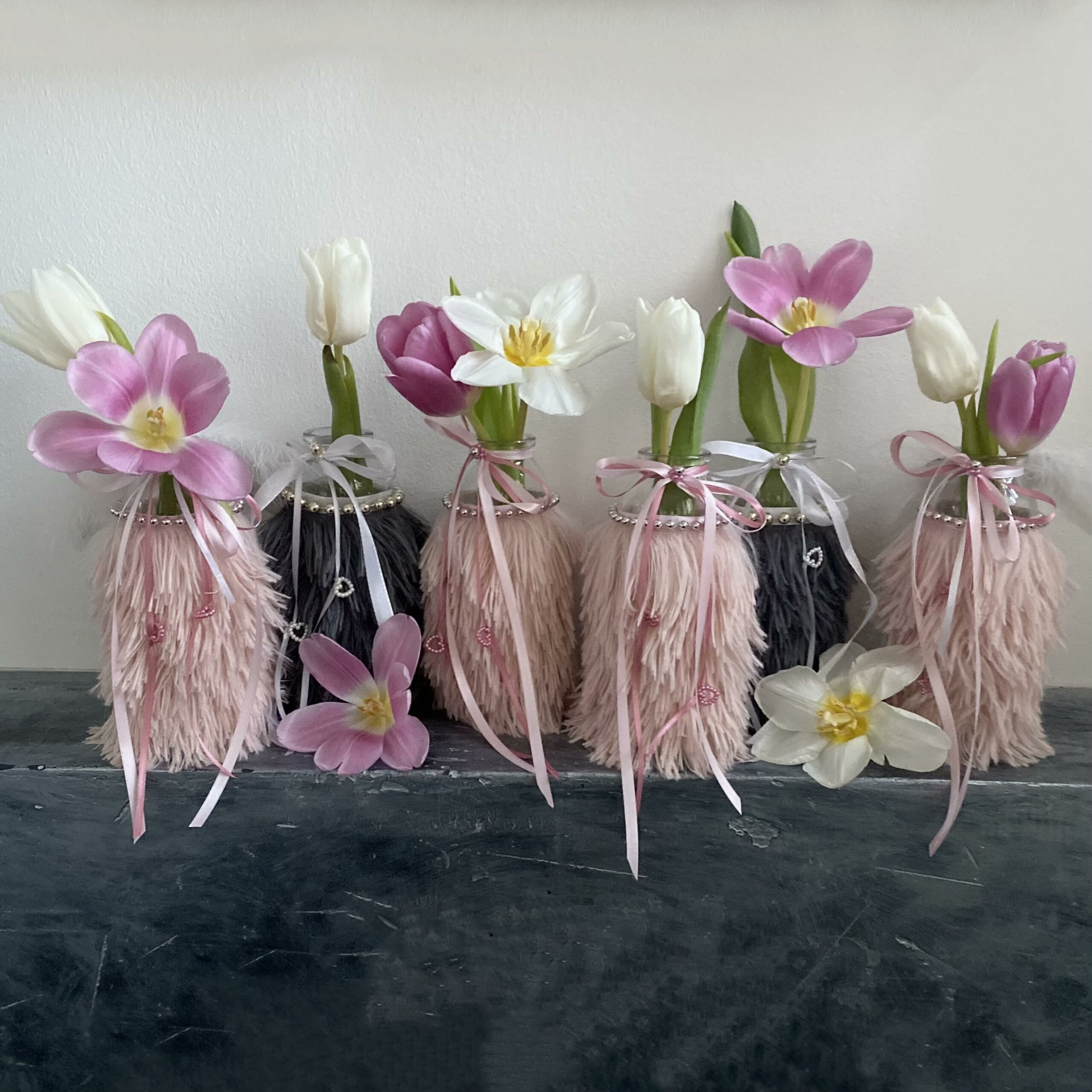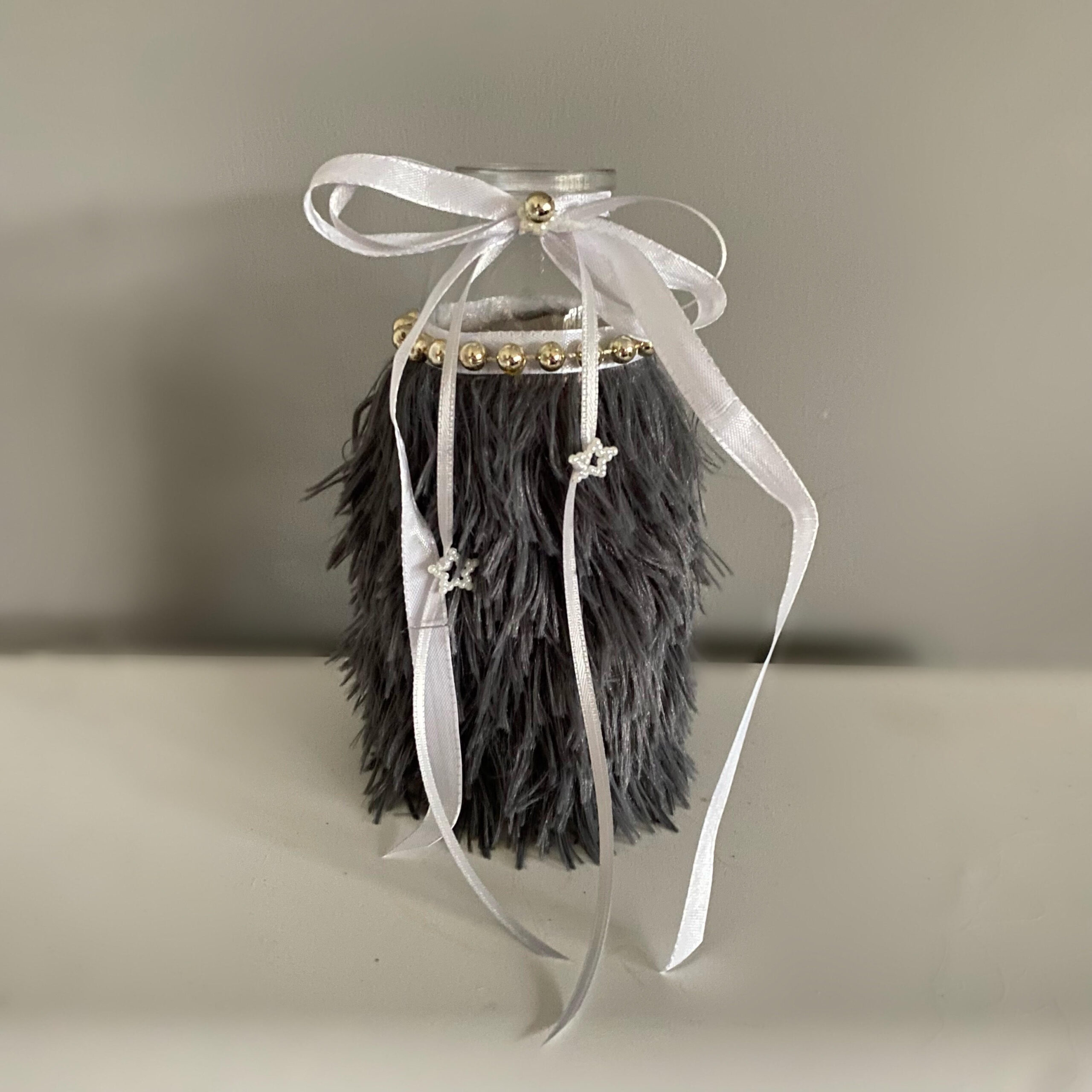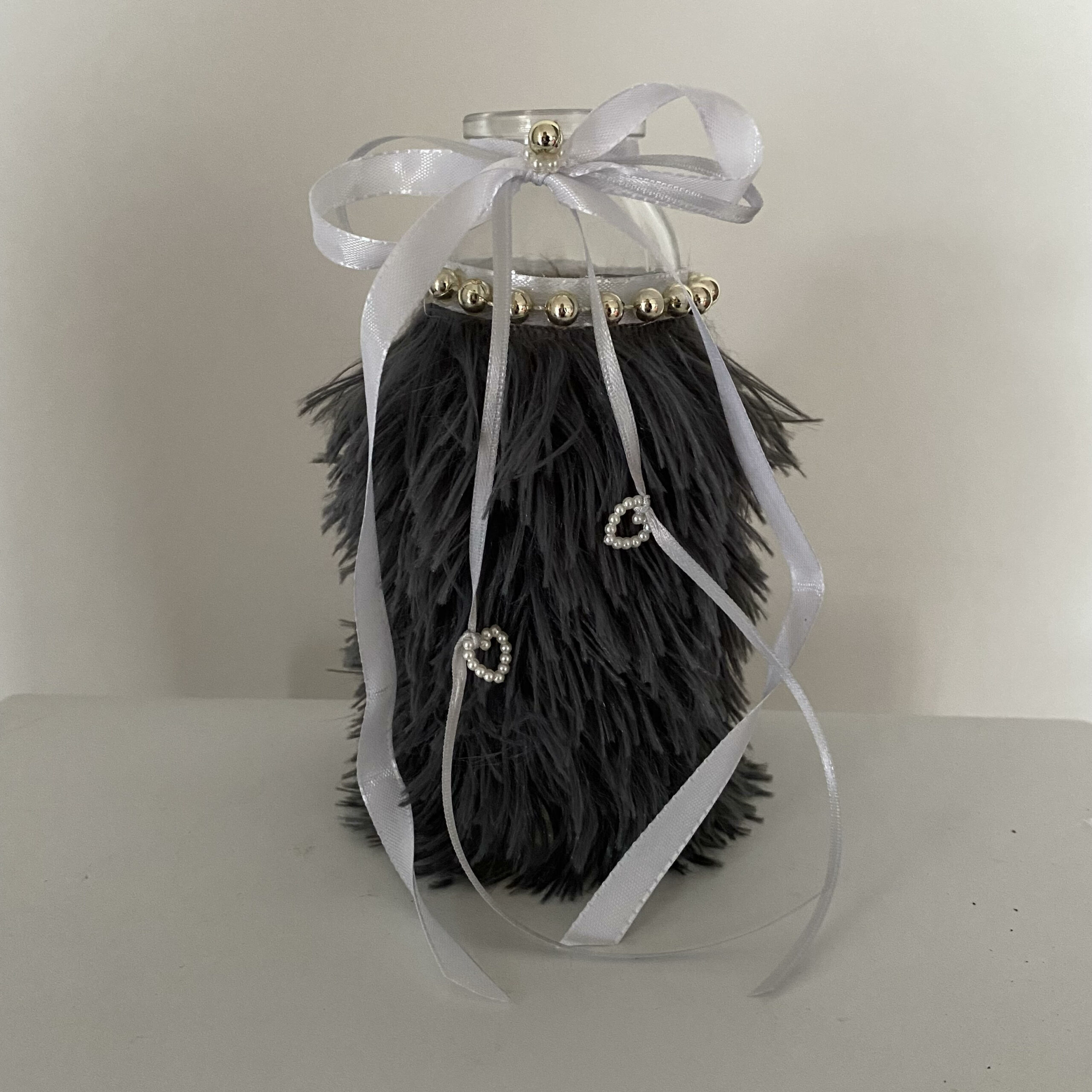 Glasvase mit anthrazitfarbenen Plüschfell verziert, sowie goldenen Halskettchen und weiß/grauen Schleifenbändchen mit Perlenanhängern Herz oder Stern.