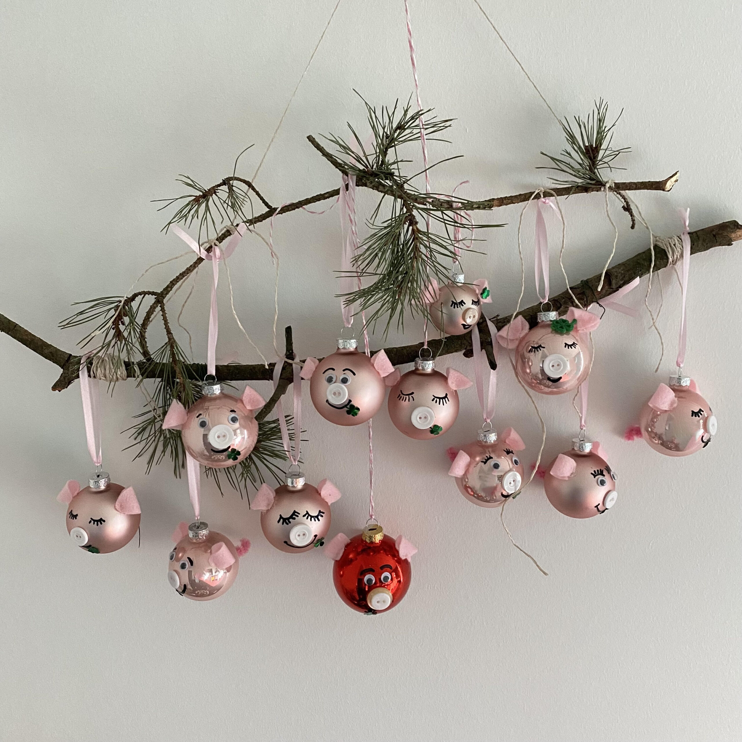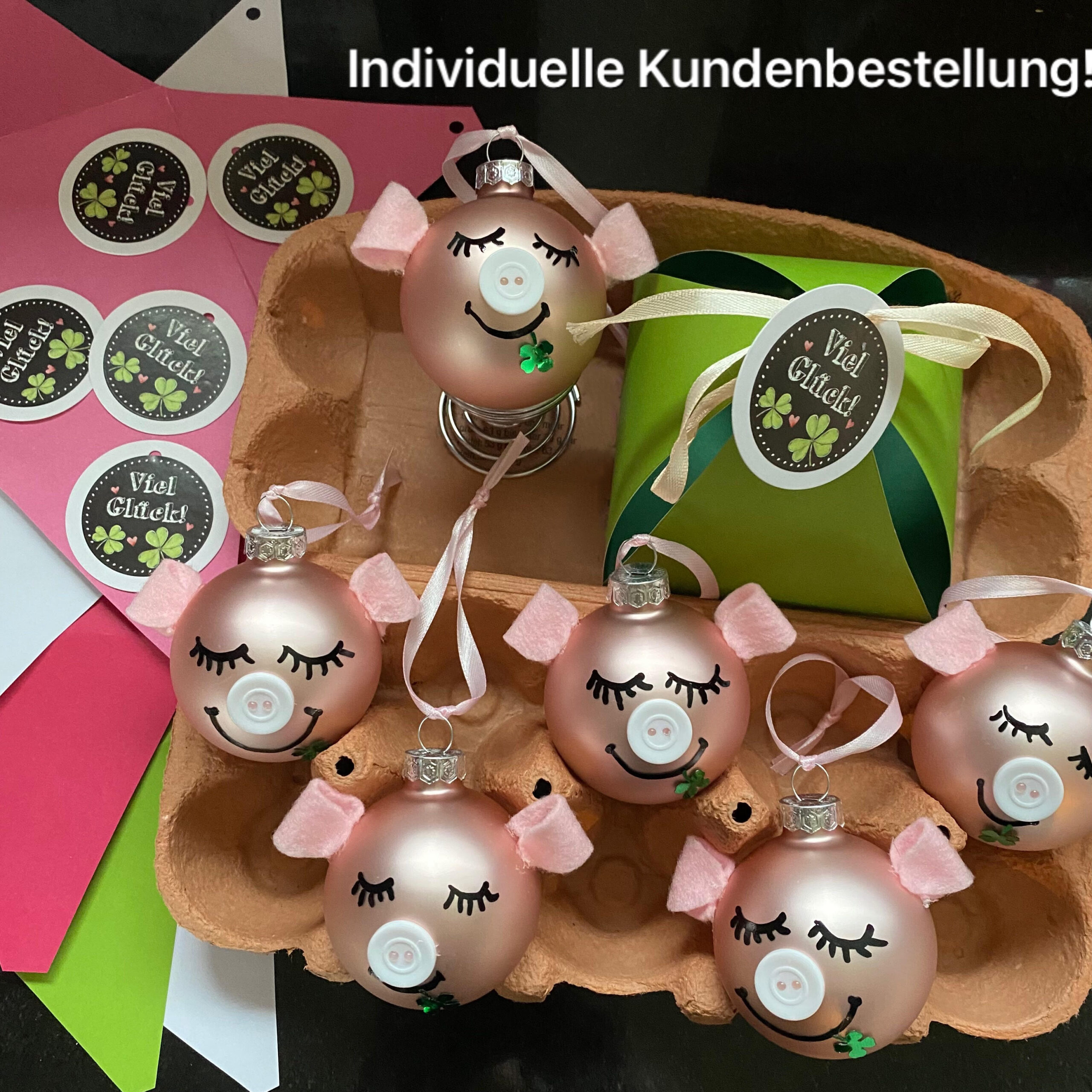 Selbstgemachtes GLÜCKSSCHWEIN aus rosa Weihnachtsglaskugel matt oder glänzend mit schlafenden Augen oder Kulleraugen, Glücksklee und Ringelschwänzchen.