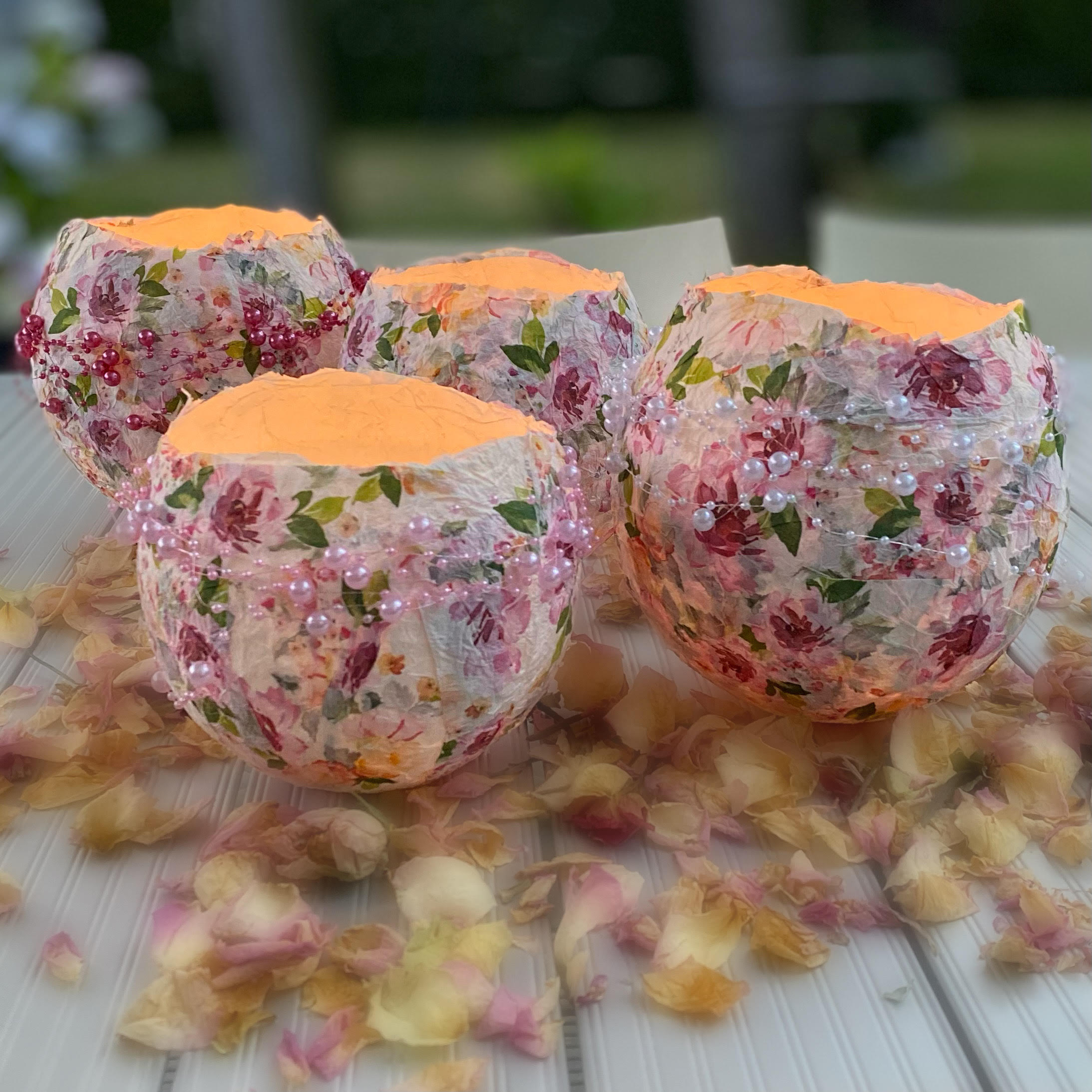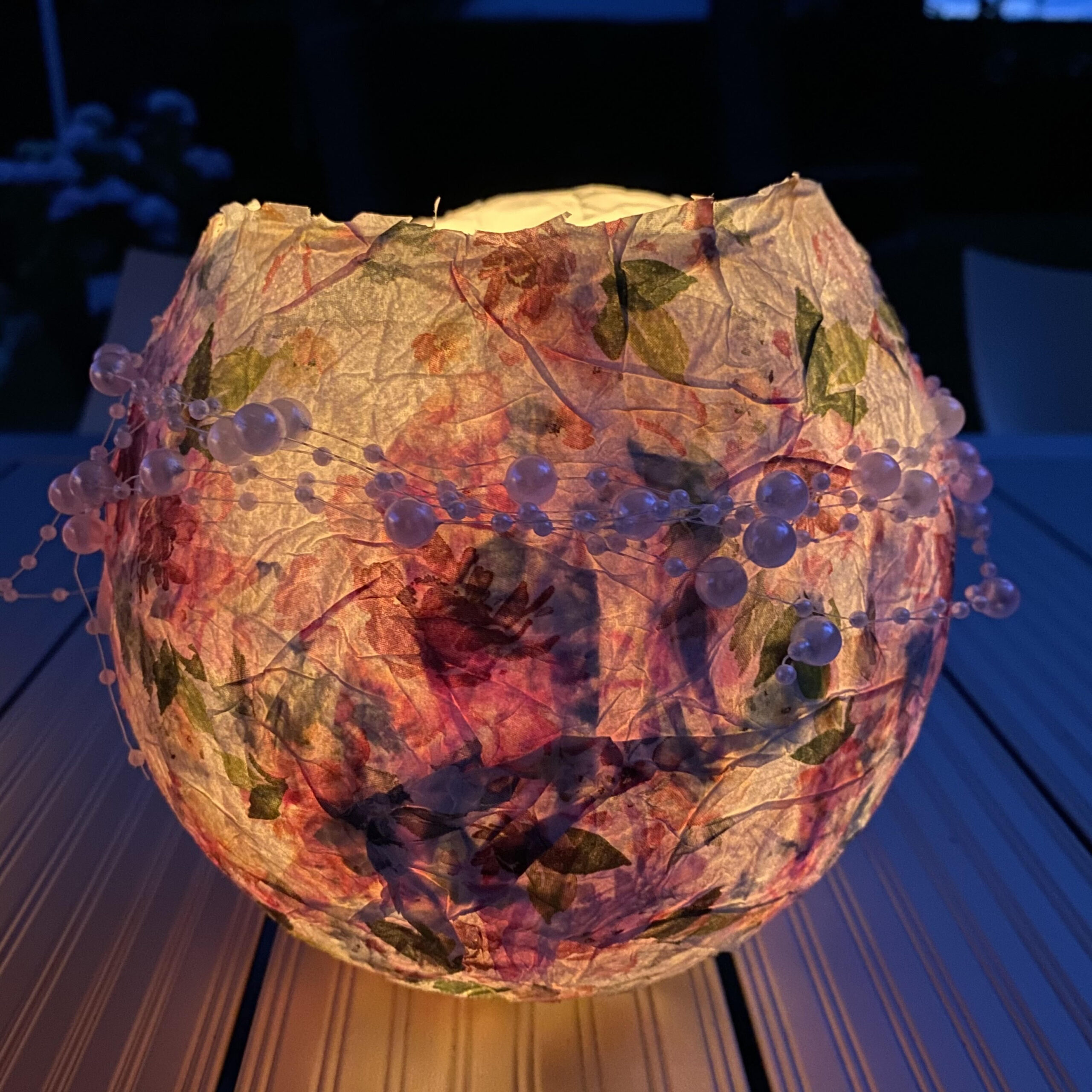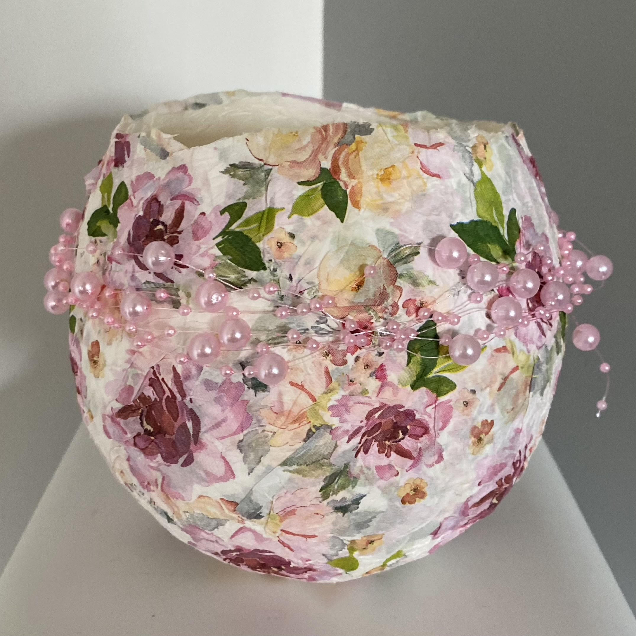Blumiges Windlicht aus Pappmaché mit rosa Perlenkette verziert,